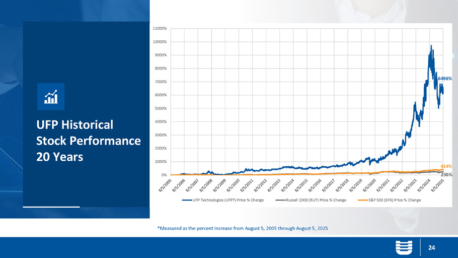 UFP Historical Stock Performance 20 Years 24 *Measured as the percent increase from August 5 , 2005 through August 5, 2025 0% 1000% 2000% 3000% 4000% 5000% 6000% 7000% 8000% 9000% 10000% 11000% UFP Technologies (UFPT) Price % Change Russell 2000 (RUT) Price % Change S&P 500 (SPX) Price % Change 6496% 236% 414%