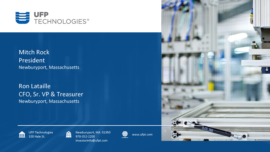 Mitch Rock President Newburyport, Massachusetts Ron Lataille CFO, Sr. VP & Treasurer Newburyport, Massachusetts UFP Technologies 100 Hale St. Newburyport, MA 01950 978 - 352 - 2200 investorinfo@ufpt.com www.ufpt.com