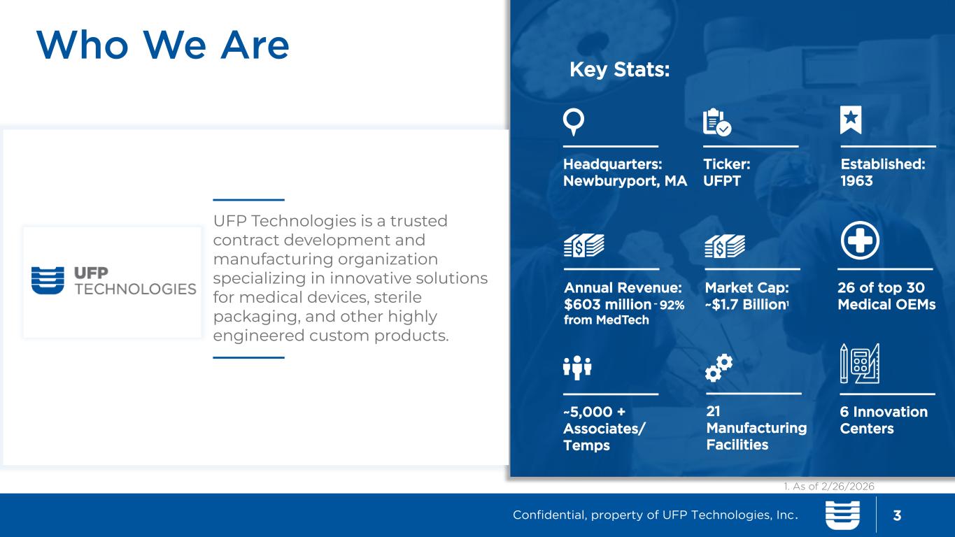 Ron Lataille CFO, Sr. VP & Treasurer Newburyport, Massachusetts UFP Technologies 100 Hale St. Newburyport, MA 01950 978-352-2200 investorinfo@ufpt.com www.ufpt.com Confidential, property of UFP Technologies, Inc. Jeff Bailly CEO Newburyport, Massachusetts