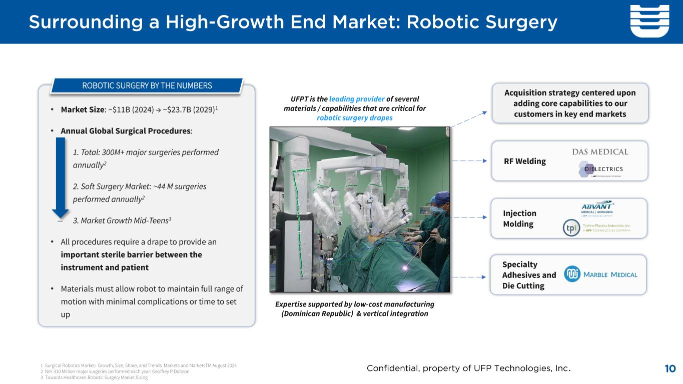 Medical Segment Overview $550 Billion Global Device Market, 6.0% CAGR1 Therapeutic Area % of Medical Sales2 1 Fortune Business Insights - $542 billion as of 2024. 6% CAGR for a forecast period of 2025-2032. 2 Annual mix of revenue through December 2025 Market Growth Robotic Surgery 29% Mid Teens Surfaces & Support 23% LDD Interventional & Surgical 21% LSD Infection Prevention 9% MSD Orthopedics 6% MSD Therapeutics 4% MSD Wound Care 4% MSD Diagnostics 3% MSD Other 1% LSD 9Confidential, property of UFP Technologies, Inc.