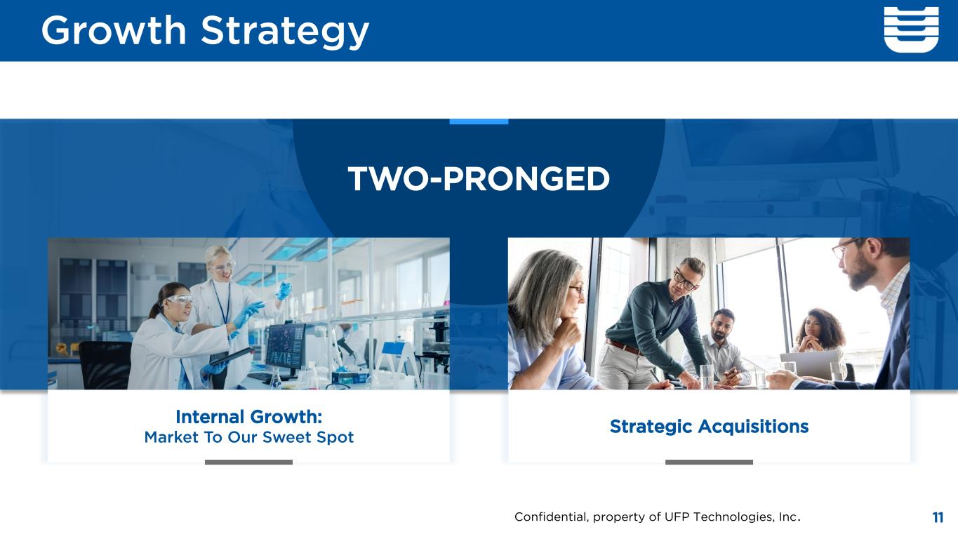 Surrounding a High-Growth End Market: Robotic Surgery 1 Surgical Robotics Market: Growth, Size, Share, and Trends Markets and MarketsTM August 2024 2 NIH 310 Million major surgeries performed each year: Geoffrey P Dobson 3 Towards Healthcare: Robotic Surgery Market Sizing • Market Size: ~$11B (2024) → ~$23.7B (2029)1 • Annual Global Surgical Procedures: ̶ 1. Total: 300M+ major surgeries performed annually2 ̶ 2. Soft Surgery Market: ~44 M surgeries performed annually2 ̶ 3. Market Growth Mid-Teens3 • All procedures require a drape to provide an important sterile barrier between the instrument and patient • Materials must allow robot to maintain full range of motion with minimal complications or time to set up Acquisition strategy centered upon adding core capabilities to our customers in key end markets UFPT is the leading provider of several materials / capabilities that are critical for robotic surgery drapes Expertise supported by low-cost manufacturing (Dominican Republic) & vertical integration Specialty Adhesives and Die Cutting RF Welding Injection Molding ROBOTIC SURGERY BY THE NUMBERS 10Confidential, property of UFP Technologies, Inc.