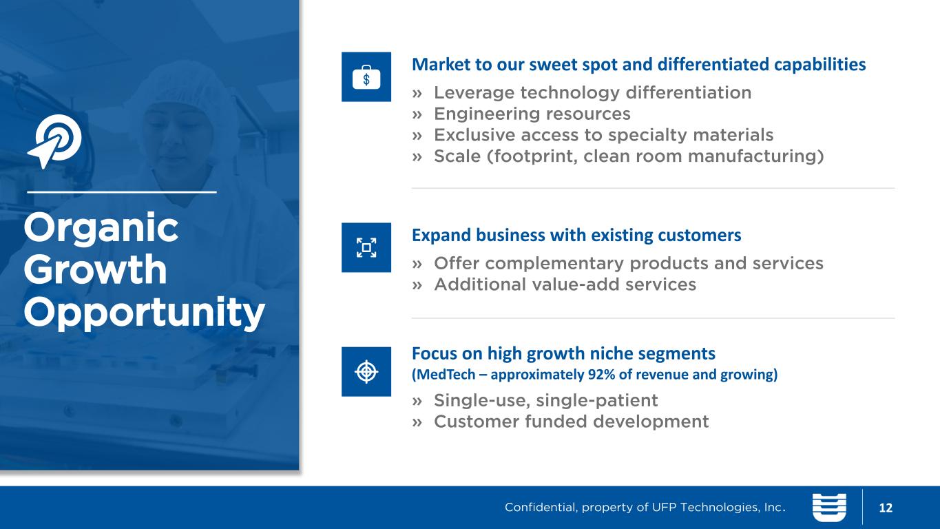 Growth Strategy 11 Internal Growth: Market To Our Sweet Spot Strategic Acquisitions TWO-PRONGED Confidential, property of UFP Technologies, Inc.