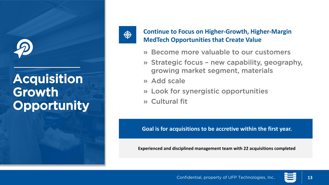 12 Organic Growth Opportunity Focus on high growth niche segments (MedTech – approximately 92% of revenue and growing) » Single-use, single-patient » Customer funded development Market to our sweet spot and differentiated capabilities » Leverage technology differentiation » Engineering resources » Exclusive access to specialty materials » Scale (footprint, clean room manufacturing) Expand business with existing customers » Offer complementary products and services » Additional value-add services Confidential, property of UFP Technologies, Inc.