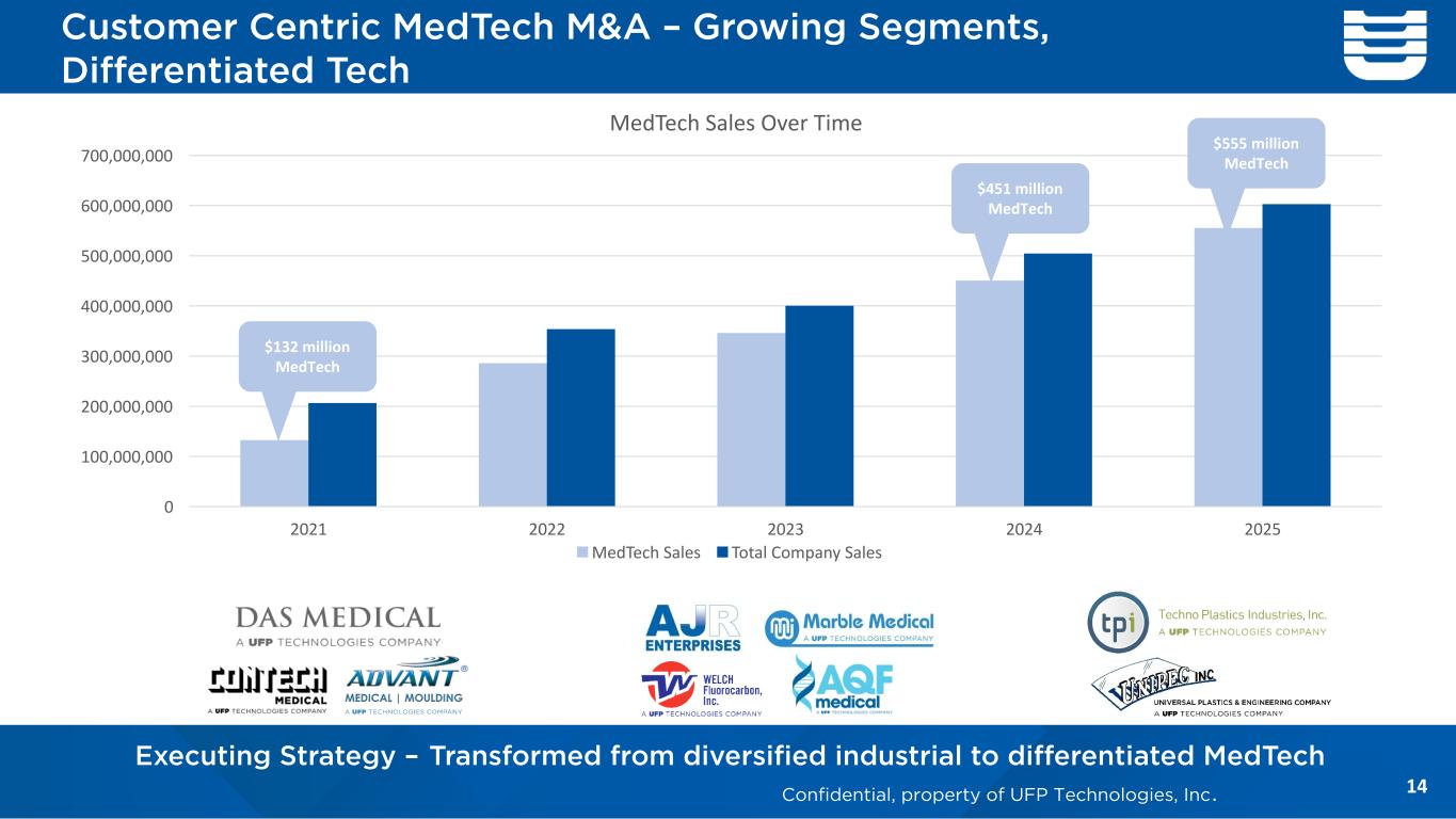 13 Acquisition Growth Opportunity Continue to Focus on Higher-Growth, Higher-Margin MedTech Opportunities that Create Value » Become more valuable to our customers » Strategic focus – new capability, geography, growing market segment, materials » Add scale » Look for synergistic opportunities » Cultural fit Goal is for acquisitions to be accretive within the first year. Experienced and disciplined management team with 22 acquisitions completed Confidential, property of UFP Technologies, Inc.