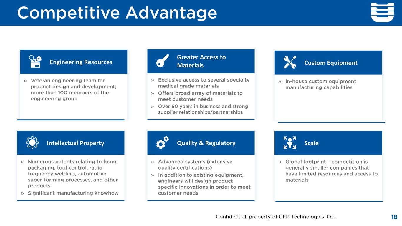 17 Significant Market Growth Opportunities Market Focused On » Better Patient Outcomes » Infection Prevention » Reducing Healthcare Costs Global Footprint » Bringing New Opportunities Focused on fast growing segments Confidential, property of UFP Technologies, Inc.