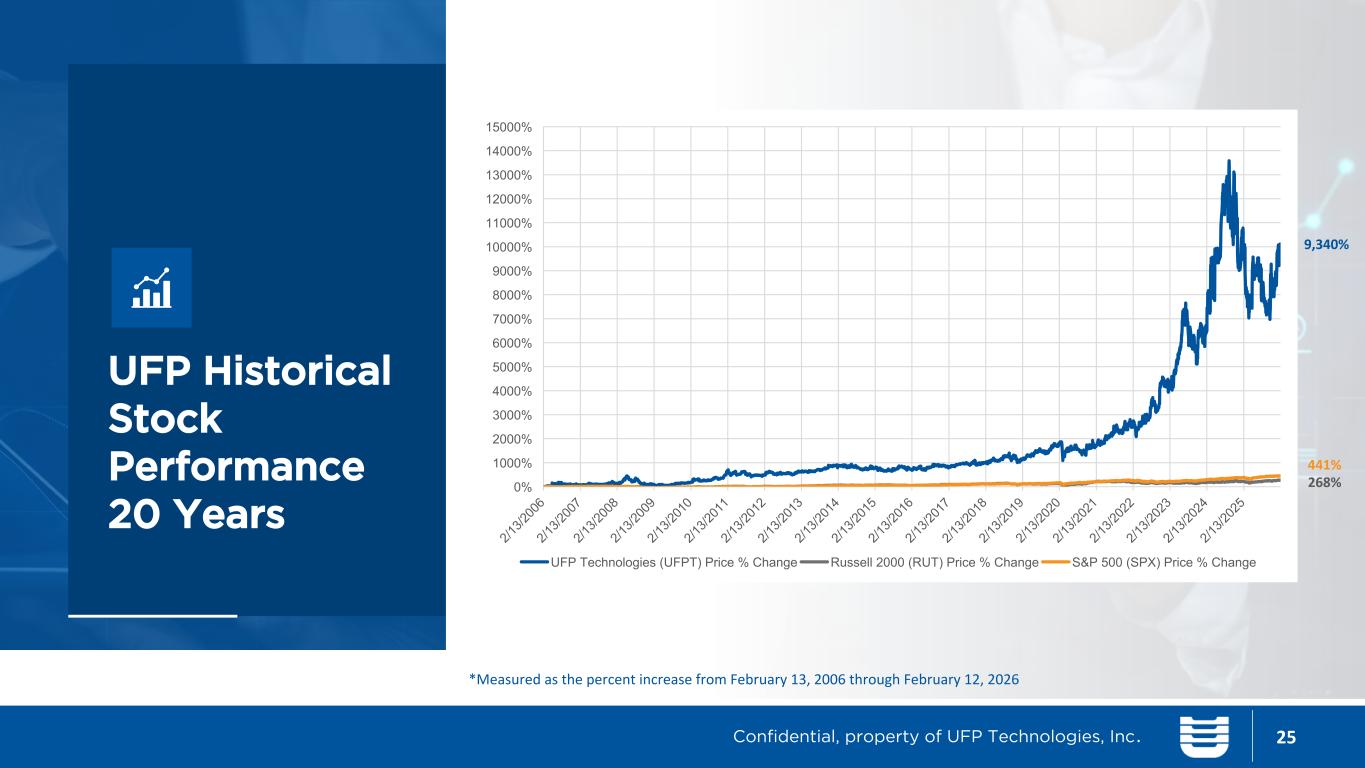 UFP Historical Stock Performance 20 Years 25 *Measured as the percent increase from February 13, 2006 through February 12, 2026 9,340% 268% 441% Confidential, property of UFP Technologies, Inc. 2/1 3/2 00 6 2/1 3/2 00 7 2/1 3/2 00 8 2/1 3/2 00 9 2/1 3/2 01 0 2/1 3/2 01 1 2/1 3/2 01 2 2/1 3/2 01 3 2/1 3/2 01 4 2/1 3/2 01 5 2/1 3/2 01 6 2/1 3/2 01 7 2/1 3/2 01 8 2/1 3/2 01 9 2/1 3/2 02 0 2/1 3/2 02 1 2/1 3/2 02 2 2/1 3/2 02 3 2/1 3/2 02 4 2/1 3/2 02 5 0% 1000% 2000% 3000% 4000% 5000% 6000% 7000% 8000% 9000% 10000% 11000% 12000% 13000% 14000% 15000% UFP Technologies (UFPT) Price % Change Russell 2000 (RUT) Price % Change S&P 500 (SPX) Price % Change