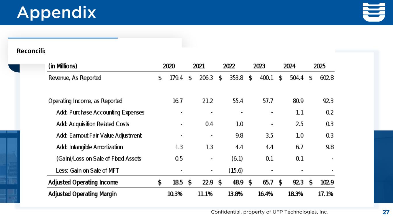 Appendix Reconciliation of Non-GAAP Results 27Confidential, property of UFP Technologies, Inc.