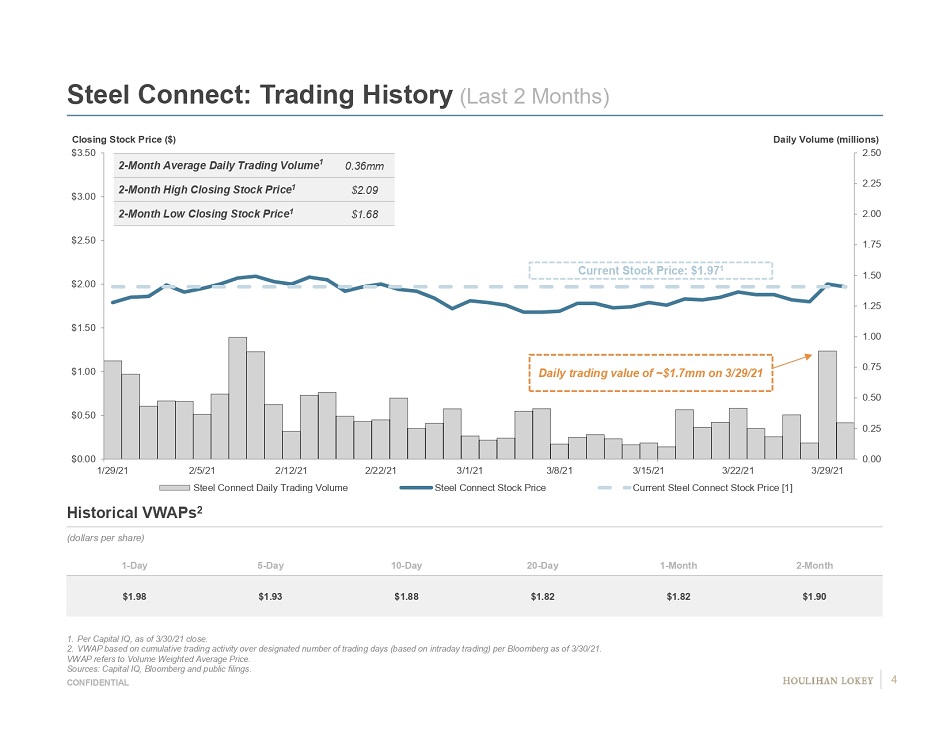 CONFIDENTIAL Steel Connect: Trading History (Last 3 Years) 1. Per Capital IQ, as of 3/30/21 close . FY refers to Fiscal Year; Q refers to Quarter. Sources: Capital IQ and public filings. Event a Date Comment 11/19/20 Steel Connect announced that Steel Partners made a non - binding expression of interest to acquire the remaining interest that it did not already own in Steel Connect on November 19, 2020. Under the proposed transaction, each share of Steel Connect’s common stock will be exchanged for a per share consideration consisting of cash and units of Steel Partners Holdings L.P.’s publicly traded 6% Series A Preferred Units, imp lyi ng a $0.65 - $0.72 per share value range of the Steel Connect’s common stock. Various Announcement of Steel Connect’s recent quarterly or annual financial results 0.00 5.00 10.00 15.00 20.00 25.00 30.00 $0.00 $0.50 $1.00 $1.50 $2.00 $2.50 $3.00 $3.50 3/30/18 6/30/18 9/30/18 12/31/18 3/31/19 6/30/19 9/30/19 12/31/19 3/31/20 6/30/20 9/30/20 12/31/20 Steel Connect Daily Trading Volume Steel Connect Stock Price Closing Stock Price ($) Daily Volume (millions) Selected Key Events 1 - Year 3 - Year Average Daily Trading Volume 1 0.42mm 0.16mm High Closing Stock Price 1 $2.67 $2.67 Low Closing Stock Price 1 $0.46 $0.46 Q2 FY 2021 (1/31/21) Q1 FY 2021 (10/31/20) Q4 and FY 2020 (7/31/20) Q3 FY 2020 (4/30/20) 2