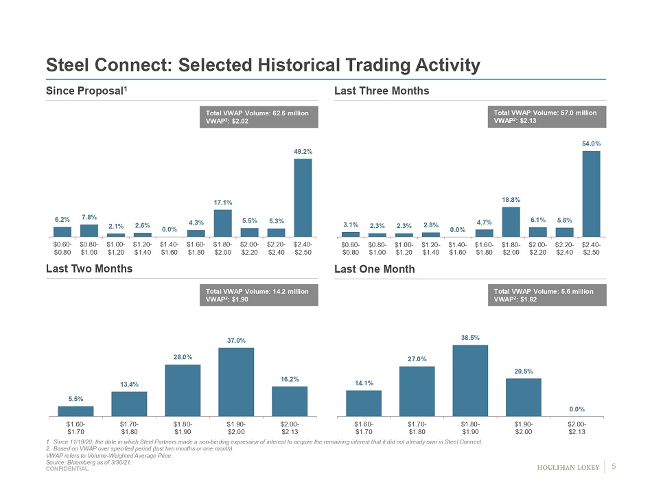 CONFIDENTIAL Steel Connect: Selected Historical Trading Activity 1. Since 11/19/20, the date in which Steel Partners made a non - binding expression of interest to acquire the remaining interest tha t it did not already own in Steel Connect. 2. Based on VWAP over specified period (last two months or one month ). VWAP refers to Volume - Weighted Average Price. Source : Bloomberg as of 3/30/21. Total VWAP Volume: 5.6 million VWAP 2 : $1.82 Since Proposal 1 Last Three Months Last Two Months Last One Month Total VWAP Volume: 62.6 million VWAP 2 : $2.02 Total VWAP Volume: 57.0 million VWAP 2 : $2.13 Total VWAP Volume: 14.2 million VWAP 2 : $1.90 5.5% 13.4% 28.0% 37.0% 16.2% $1.60- $1.70 $1.70- $1.80 $1.80- $1.90 $1.90- $2.00 $2.00- $2.13 14.1% 27.0% 38.5% 20.5% 0.0% $1.60- $1.70 $1.70- $1.80 $1.80- $1.90 $1.90- $2.00 $2.00- $2.13 6.2% 7.8% 2.1% 2.6% 0.0% 4.3% 17.1% 5.5% 5.3% 49.2% $0.60- $0.80 $0.80- $1.00 $1.00- $1.20 $1.20- $1.40 $1.40- $1.60 $1.60- $1.80 $1.80- $2.00 $2.00- $2.20 $2.20- $2.40 $2.40- $2.50 3.1% 2.3% 2.3% 2.8% 0.0% 4.7% 18.8% 6.1% 5.8% 54.0% $0.60- $0.80 $0.80- $1.00 $1.00- $1.20 $1.20- $1.40 $1.40- $1.60 $1.60- $1.80 $1.80- $2.00 $2.00- $2.20 $2.20- $2.40 $2.40- $2.50 5