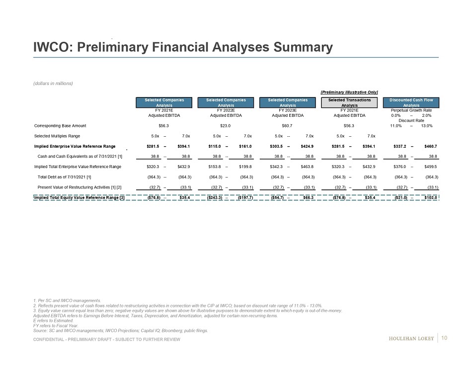 CONFIDENTIAL - PRELIMINARY DRAFT - SUBJECT TO FURTHER REVIEW IWCO: Preliminary Financial Analyses Summary (dollars in millions) 1. Per SC and IWCO managements. 2. Reflects present value of cash flows related to restructuring activities in connection with the CIP at IWCO; based on disc oun t rate range of 11.0% - 13.0%. 3. Equity value cannot equal less than zero; negative equity values are shown above for illustrative purposes to demonstrate ext ent to which equity is out - of - the - money. Adjusted EBITDA refers to Earnings Before Interest, Taxes, Depreciation, and Amortization, adjusted for certain non - recurring it ems. E refers to Estimated. FY refers to Fiscal Year. Source: SC and IWCO managements; IWCO Projections; Capital IQ; Bloomberg; public filings. [Preliminary Illlustrative Only] Selected Companies Selected Companies Selected Companies Selected Transactions Discounted Cash Flow Analysis Analysis Analysis Analysis Analysis FY 2021E FY 2022E FY 2023E FY 2021E Perpetual Growth Rate Adjusted EBITDA Adjusted EBITDA Adjusted EBITDA Adjusted EBITDA 0.0% -- 2.0% Discount Rate Corresponding Base Amount $56.3 $23.0 $60.7 $56.3 11.0% -- 13.0% Selected Multiples Range 5.0x -- 7.0x 5.0x -- 7.0x 5.0x -- 7.0x 5.0x -- 7.0x Implied Enterprise Value Reference Range $281.5 -- $394.1 $115.0 -- $161.0 $303.5 -- $424.9 $281.5 -- $394.1 $337.2 -- $460.7 Cash and Cash Equivalents as of 7/31/2021 [1] 38.8 -- 38.8 38.8 -- 38.8 38.8 -- 38.8 38.8 -- 38.8 38.8 -- 38.8 Implied Total Enterprise Value Reference Range $320.3 -- $432.9 $153.8 -- $199.8 $342.3 -- $463.8 $320.3 -- $432.9 $376.0 -- $499.5 Total Debt as of 7/31/2021 [1] (364.3) -- (364.3) (364.3) -- (364.3) (364.3) -- (364.3) (364.3) -- (364.3) (364.3) -- (364.3) Present Value of Restructuring Activities [1] [2] (32.7) -- (33.1) (32.7) -- (33.1) (32.7) -- (33.1) (32.7) -- (33.1) (32.7) -- (33.1) Implied Total Equity Value Reference Range [3] ($76.8) -- $35.4 ($243.3) -- ($197.7) ($54.7) -- $66.3 ($76.8) -- $35.4 ($21.0) -- $102.0 10