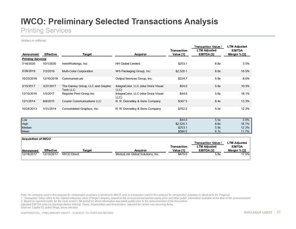 CONFIDENTIAL - PRELIMINARY DRAFT - SUBJECT TO FURTHER REVIEW IWCO: Preliminary Selected Transactions Analysis Printing Services Note: No company used in this analysis for comparative purposes is identical to IWCO, and no transaction used in this analysi s f or comparative purposes is identical to the Proposal. 1. Transaction Value refers to the implied enterprise value of target company, based on the announced transaction equity pric e a nd other public information available at the time of the announcement. 2. Based on reported metric for the most recent LTM period for which information was made public prior to the announcement of th e transaction. Adjusted EBITDA refers to Earnings Before Interest, Taxes, Depreciation and Amortization, adjusted for certain non - recurring ite ms. Sources: Capital IQ, public filings, press releases. Transaction Value / LTM Adjusted Transaction LTM Adjusted EBITDA Announced Effective Target Acquiror Value [1] EBITDA [2] Margin % [2] Printing Services 10/1/2020 InnerWorkings, Inc. HH Global Limited $253.1 6.8x 3.5% 7/2/2019 Multi-Color Corporation WS Packaging Group, Inc. $2,520.1 8.8x 16.5% 12/10/2018 Communisis plc Output Services Group, Inc. $224.7 5.9x 8.0% 3/27/2017 The Garvey Group, LLC and Graphic Tech LLC IntegraColor, LLC (nka:Orora Visual LLC) $54.0 5.8x 10.3% 1/5/2017 Register Print Group Inc. IntegraColor, LLC (nka:Orora Visual LLC) $44.0 5.8x 18.1% 6/8/2015 Courier Communications LLC R. R. Donnelley & Sons Company $307.5 8.4x 13.3% 1/31/2014 Consolidated Graphics, Inc. R. R. Donnelley & Sons Company $702.2 5.5x 12.2% Low $44.0 5.5x 3.5% High $2,520.1 8.8x 18.1% Median $253.1 5.9x 12.2% Mean $586.5 6.7x 11.7% Acquisition of IWCO Transaction Value / LTM Adjusted Transaction LTM Adjusted EBITDA Effective Target Acquiror Value [1] EBITDA [2] Margin % [2] 12/15/2017 IWCO Direct ModusLink Global Solutions, Inc. $476.0 5.8x 17.5% 7/16/2020 2/26/2019 2/15/2017 12/15/2016 10/23/2018 12/1/2014 10/24/2013 12/18/2017 Announced (dollars in millions) 22