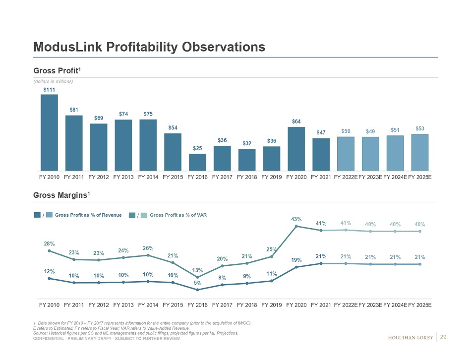 CONFIDENTIAL - PRELIMINARY DRAFT - SUBJECT TO FURTHER REVIEW $45 $31 $42 $20 $33 $26 $12 $8 $10 $3 $5 $5 $7 $10 $10 $89 $80 $36 $35 $67 $87 $19 $43 $20 - $4 $36 $0 $6 $5 $5 FY 2011 FY 2012 FY 2013 FY 2014 FY 2015 FY 2016 FY 2017 FY 2018 FY 2019 FY 2020 FY 2021 FY 2022E FY 2023E FY 2024E FY 2025E Erosion has exceeded new business in 9 of the last 11 years ModusLink Long - Term Value Added - Revenue (VAR) Performance 1. Defined as the market value of goods and services produced by the industry minus the cost of goods and services used in produ c tion. Also described as the industry’s contribution to GDP, or profit plus wages and depreciation, per IBIS World; 2. Refers to fiscal years for ModusLink and calendar years for industry data; 3. Represents 9 - year (CY 2011 – 2020) CAGR due to unavailability of CY 2010 data. CAGR refers to Compound Annual Growth Rate; E refers to Estimated; FY refers to Fiscal Year; VAR refers to Value - Added Revenue. Source: SC and ML managements, IBIS World, World Bank, historical figures per SC and ML managements and public filings, projected figures per ML Projections . ModusLink VAR vs. Third Party Logistics Industry Value Added (“IVA”) 1 (VAR dollars in millions; IVA dollars in billions) VAR: New Business vs. Erosion (dollars in millions) New Business Erosion VAR IVA / / New Business refers to new customers or new programs with existing customers Erosion refers to VAR declines from existing customer programs $390 $346 $298 $304 $289 $254 $193 $186 $151 $142 $148 $117 $122 $124 $128 $133 $35 $36 $37 $37 $38 $39 $41 $46 $49 $50 $52 $54 $56 $58 $61 $- $100.0 $200.0 $300.0 $400.0 $500.0 $600.0 $700.0 $800.0 $900.0 $1,000.0 FY 2010 FY 2011 FY 2012 FY 2013 FY 2014 FY 2015 FY 2016 FY 2017 FY 2018 FY 2019 FY 2020 FY 2021 FY 2022E FY 2023E FY 2024E FY 2025E $0.0 $10.0 $20.0 $30.0 $40.0 $50.0 $60.0 $70.0 CAGRs 2 VAR IVA 10 - Year (2010 – 2020) (9.2%) 4.0% 3 5 - Year (2015 – 2020) (10.2%) 5.6% 4 - Year (2021 – 2025E) 3.3% 4.4% 28
