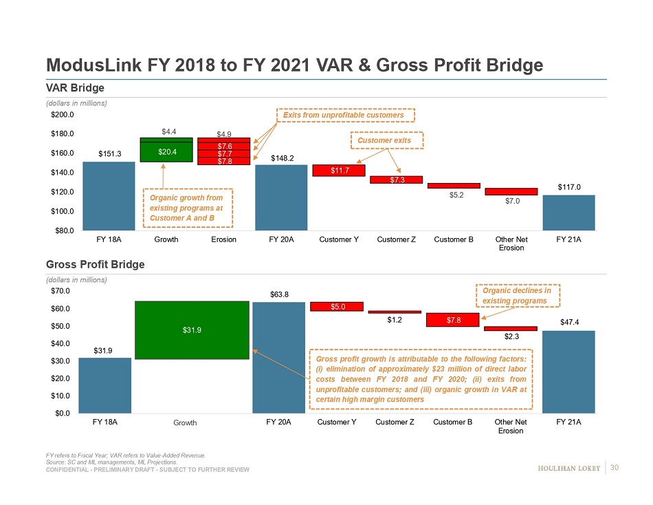 CONFIDENTIAL - PRELIMINARY DRAFT - SUBJECT TO FURTHER REVIEW $31.9 $63.8 $47.4 $5.0 $1.2 $7.8 $2.3 $0.0 $10.0 $20.0 $30.0 $40.0 $50.0 $60.0 $70.0 FY 18A FY 20A Customer Y Customer Z Customer B Other Net Erosion FY 21A $151.3 $148.2 $117.0 $20.4 $7.8 $11.7 $7.3 $5.2 $7.0 $4.4 $7.7 $7.6 $4.9 $80.0 $100.0 $120.0 $140.0 $160.0 $180.0 $200.0 FY 18A Growth Erosion FY 20A Customer Y Customer Z Customer B Other Net Erosion FY 21A ModusLink FY 2018 to FY 2021 VAR & Gross Profit Bridge FY refers to Fiscal Year; VAR refers to Value - Added Revenue. Source: SC and ML managements, ML Projections. Gross Profit Bridge (dollars in millions) VAR Bridge (dollars in millions) Gross profit growth is attributable to the following factors : (i) elimination of approximately $ 23 million of direct labor costs between FY 2018 and FY 2020 ; (ii) exits from unprofitable customers ; and (iii) organic growth in VAR at certain high margin customers Exits from unprofitable customers Organic growth from existing programs at Customer A and B Customer exits Organic declines in existing programs $31.9 Growth 30