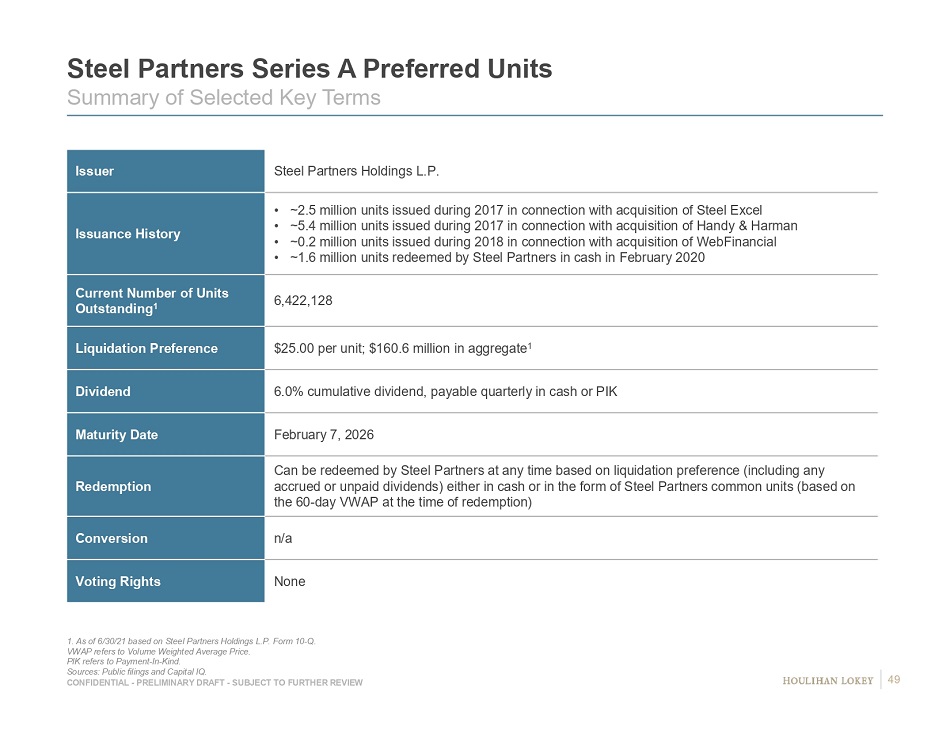 CONFIDENTIAL - PRELIMINARY DRAFT - SUBJECT TO FURTHER REVIEW Steel Partners Series A Preferred Units Summary of Selected Key Terms 1. As of 6/30/21 based on Steel Partners Holdings L.P. Form 10 - Q. VWAP refers to Volume Weighted Average Price. PIK refers to Payment - In - Kind. Sources: Public filings and Capital IQ. Issuer Steel Partners Holdings L.P. Issuance History • ~2.5 million units issued during 2017 in connection with acquisition of Steel Excel • ~5.4 million units issued during 2017 in connection with acquisition of Handy & Harman • ~0.2 million units issued during 2018 in connection with acquisition of WebFinancial • ~1.6 million units redeemed by Steel Partners in cash in February 2020 Current Number of Units Outstanding 1 6,422,128 Liquidation Preference $25.00 per unit; $160.6 million in aggregate 1 Dividend 6.0% cumulative dividend, payable quarterly in cash or PIK Maturity Date February 7, 2026 Redemption Can be redeemed by Steel Partners at any time based on liquidation preference (including any accrued or unpaid dividends) either in cash or in the form of Steel Partners common units (based on the 60 - day VWAP at the time of redemption) Conversion n/a Voting Rights None 49