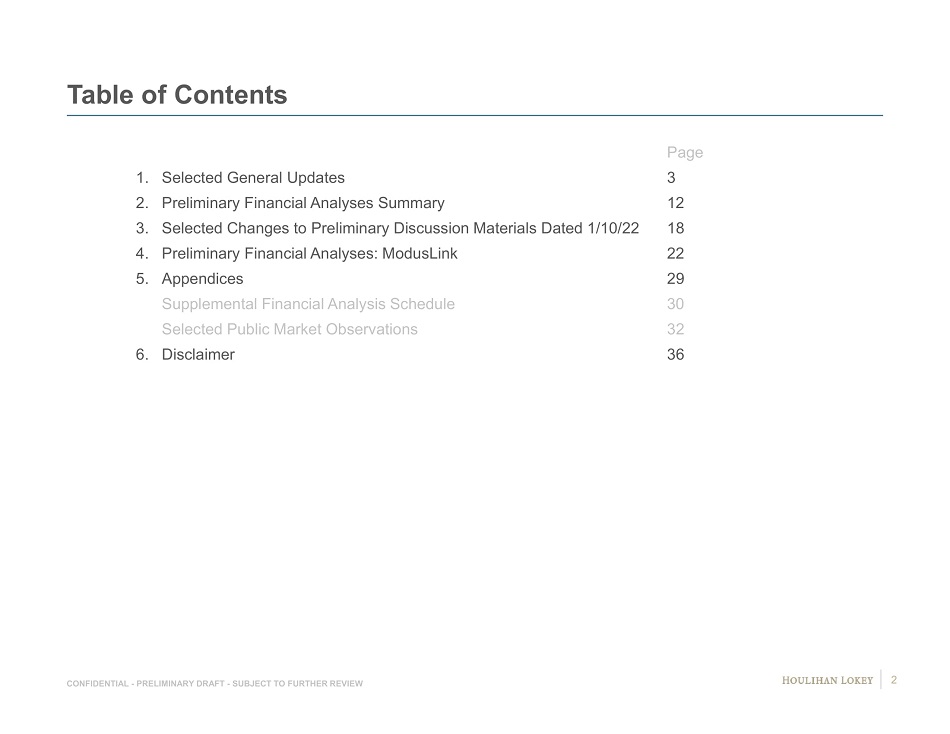 CONFIDENTIAL - PRELIMINARY DRAFT - SUBJECT TO FURTHER REVIEW Table of Contents 2 Page 1. Selected General Updates 3 2. Preliminary Financial Analyses Summary 12 3. Selected Changes to Preliminary Discussion Materials Dated 1/10/22 18 4. Preliminary Financial Analyses: ModusLink 22 5. Appendices 29 Supplemental Financial Analysis Schedule 30 Selected Public Market Observations 32 6. Disclaimer 36
