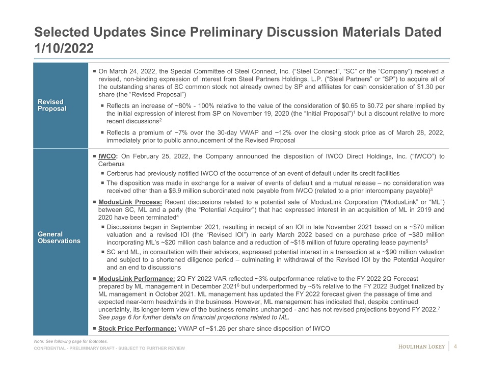 CONFIDENTIAL - PRELIMINARY DRAFT - SUBJECT TO FURTHER REVIEW Selected Updates Since Preliminary Discussion Materials Dated 1/10/2022 Revised Proposal On March 24 , 2022 , the Special Committee of Steel Connect, Inc . (“Steel Connect”, “SC” or the “Company”) received a revised, non - binding expression of interest from Steel Partners Holdings, L . P . (“Steel Partners” or “SP”) to acquire all of the outstanding shares of SC common stock not already owned by SP and affiliates for cash consideration of $ 1 . 30 per share (the “Revised Proposal”) Reflects an increase of ~ 80 % - 100 % relative to the value of the consideration of $ 0 . 65 to $ 0 . 72 per share implied by the initial expression of interest from SP on November 19 , 2020 (the “Initial Proposal”) 1 but a discount relative to more recent discussions 2 Reflects a premium of ~ 7 % over the 30 - day VWAP and ~ 12 % over the closing stock price as of March 28 , 2022 , immediately prior to public announcement of the Revised Proposal General Observations IWCO : On February 25 , 2022 , the Company announced the disposition of IWCO Direct Holdings, Inc . (“IWCO”) to Cerberus Cerberus had previously notified IWCO of the occurrence of an event of default under its credit facilities The disposition was made in exchange for a waiver of events of default and a mutual release – no consideration was received other than a $ 6 . 9 million subordinated note payable from IWCO (related to a prior intercompany payable) 3 ModusLink Process : Recent discussions related to a potential sale of ModusLink Corporation (“ ModusLink ” or “ML”) between SC, ML and a party (the “Potential Acquiror”) that had expressed interest in an acquisition of ML in 2019 and 2020 have been terminated 4 Discussions began in September 2021 , resulting in receipt of an IOI in late November 2021 based on a ~ $ 70 million valuation and a revised IOI (the “Revised IOI”) in early March 2022 based on a purchase price of ~ $ 80 million incorporating ML’s ~ $ 20 million cash balance and a reduction of ~ $ 18 million of future operating lease payments 5 SC and ML, in consultation with their advisors, expressed potential interest in a transaction at a ~ $ 90 million valuation and subject to a shortened diligence period – culminating in withdrawal of the Revised IOI by the Potential Acquiror and an end to discussions ModusLink Performance: 2Q FY 2022 VAR reflected ~3% outperformance relative to the FY 2022 2Q Forecast prepared by ML management in December 2021 6 but underperformed by ~5% relative to the FY 2022 Budget finalized by ML management in October 2021. ML management has updated the FY 2022 forecast given the passage of time and expected near - term headwinds in the business. However, ML management has indicated that, despite continued uncertainty, its longer - term view of the business remains unchanged - and has not revised projections beyond FY 2022. 7 See page 6 for further details on financial projections related to ML. Stock Price Performance: VWAP of ~$1.26 per share since disposition of IWCO Note: See following page for footnotes. 4