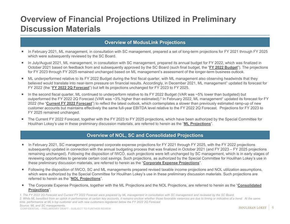 CONFIDENTIAL - PRELIMINARY DRAFT - SUBJECT TO FURTHER REVIEW Overview of Financial Projections Utilized in Preliminary Discussion Materials Overview of ModusLink Projections Overview of NOL, SC and Consolidated Projections In February 2021, ML management, in consultation with SC management, prepared a set of long - term projections for FY 2021 through FY 2025 which were subsequently reviewed by the SC Board. In July/August 2021, ML management, in consultation with SC management, prepared its annual budget for FY 2022, which was fin ali zed in October 2021 based on feedback from and subsequently approved by the SC Board (such final budget, the “ FY 2022 Budget ”). The projections for FY 2023 through FY 2025 remained unchanged based on ML management’s assessment of the longer - term business outlook. ML underperformed relative to its FY 2022 Budget during the first fiscal quarter, with ML management also observing headwinds th at they believed would translate into near - term pressure on financial results. Accordingly, in December 2021, ML management 1 updated its forecast for FY 2022 (the “ FY 2022 2Q Forecast ”) but left its projections unchanged for FY 2023 to FY 2025. In the second fiscal quarter, ML continued to underperform relative to its FY 2022 Budget (VAR was ~5% lower than budgeted) b ut outperformed the FY 2022 2Q Forecast (VAR was ~3% higher than estimated). 2 In February 2022, ML management 1 updated its forecast for FY 2022 (the “ Current FY 2022 Forecast ”) to reflect the latest outlook, which contemplates a slower than previously estimated ramp - up of new customer accounts but maintains effectively the same full - year EBITDA level relative to the FY 2022 2Q Forecast. Projections fo r FY 2023 to FY 2025 remained unchanged. The Current FY 2022 Forecast, together with the FY 2023 to FY 2025 projections, which have been authorized by the Special Com mit tee for Houlihan Lokey’s use in these preliminary discussion materials, are referred to herein as the “ ML Projections ”. In February 2021, SC management prepared corporate expense projections for FY 2021 through FY 2025, with the FY 2022 projecti ons subsequently updated in connection with the annual budgeting process that was finalized in October 2021 (and FY 2023 – FY 2025 p rojections remaining unchanged). Following the disposition of IWCO, such projections were left unchanged by SC management, which is in e arl y stages of reviewing opportunities to generate certain cost savings. Such projections, as authorized by the Special Committee for Houlih an Lokey’s use in these preliminary discussion materials, are referred to herein as the “ Corporate Expense Projections ”. Following the disposition of IWCO, SC and ML managements prepared revised taxable income projections and NOL utilization assu mpt ions, which were authorized by the Special Committee for Houlihan Lokey’s use in these preliminary discussion materials. Such proje cti ons are referred to herein as the “ NOL Projections ”. The Corporate Expense Projections, together with the ML Projections and the NOL Projections, are referred to herein as the “ Consolidated Projections ”. 1. The FY 2022 2Q Forecast and Current FY 2022 Forecast were prepared by ML management in consultation with SC management and re viewed by the SC Board. 2. While ML benefited from an uptick in performance at certain key accounts, it remains unclear whether those favorable varia nce s are due to timing or indicative of a trend. At the same time, performance at ML’s top customer and with new customers registered below the FY 2022 2Q Forecast . Source: ML and SC managements. 6
