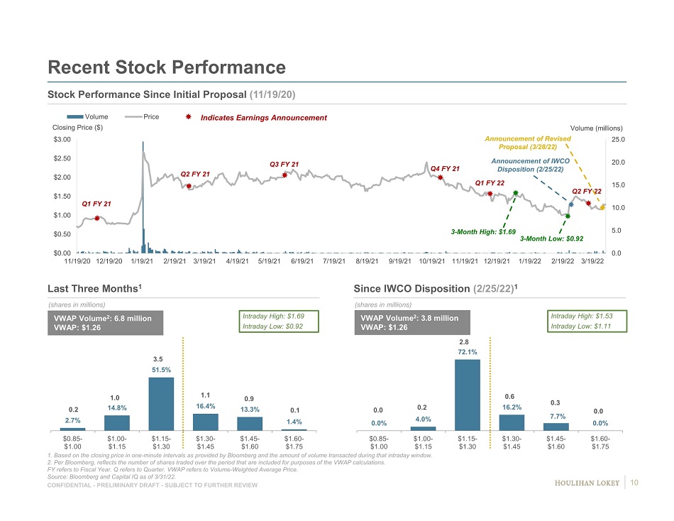 CONFIDENTIAL - PRELIMINARY DRAFT - SUBJECT TO FURTHER REVIEW 0.0% 4.0% 72.1% 16.2% 7.7% 0.0% 0.0 0.2 0.6 0.3 0.0 $0.85- $1.00 $1.00- $1.15 $1.15- $1.30 $1.30- $1.45 $1.45- $1.60 $1.60- $1.75 2.7% 14.8% 51.5% 16.4% 13.3% 1.4% 0.2 1.0 3.5 1.1 0.9 0.1 $0.85- $1.00 $1.00- $1.15 $1.15- $1.30 $1.30- $1.45 $1.45- $1.60 $1.60- $1.75 3 - Month High: $1.69 3 - Month Low: $0.92 0.0 5.0 10.0 15.0 20.0 25.0 $0.00 $0.50 $1.00 $1.50 $2.00 $2.50 $3.00 11/19/20 12/19/20 1/19/21 2/19/21 3/19/21 4/19/21 5/19/21 6/19/21 7/19/21 8/19/21 9/19/21 10/19/21 11/19/21 12/19/21 1/19/22 2/19/22 3/19/22 Volume (millions) Closing Price ($) Volume Price Recent Stock Performance Stock Performance Since Initial Proposal (11/19/20) Last Three Months 1 Since IWCO Disposition (2/25/22) 1 (shares in millions) (shares in millions) Intraday High : $ 1 . 69 Intraday Low : $ 0 . 92 Intraday High : $ 1 . 53 Intraday Low : $ 1 . 11 1. Based on the closing price in one - minute intervals as provided by Bloomberg and the amount of volume transacted during that i ntraday window. 2. Per Bloomberg, reflects the number of shares traded over the period that are included for purposes of the VWAP calculation s. FY refers to Fiscal Year. Q refers to Quarter. VWAP refers to Volume - Weighted Average Price. Source: Bloomberg and Capital IQ as of 3/31/22. Indicates Earnings Announcement Q1 FY 21 Q2 FY 21 Q3 FY 21 Q4 FY 21 Q2 FY 22 Announcement of IWCO Disposition (2/25/22) VWAP Volume 2 : 6.8 million VWAP: $1.26 VWAP Volume 2 : 3.8 million VWAP: $1.26 Q1 FY 22 2.8 Announcement of Revised Proposal (3/28/22) 10