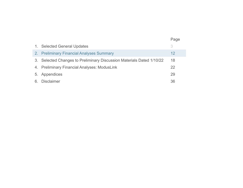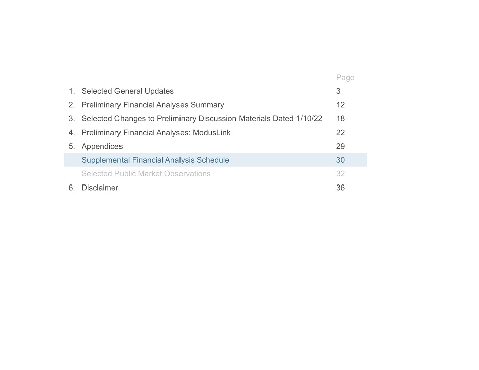 Page 1. Selected General Updates 3 2. Preliminary Financial Analyses Summary 12 3. Selected Changes to Preliminary Discussion Materials Dated 1/10/22 18 4. Preliminary Financial Analyses: ModusLink 22 5. Appendices 29 Supplemental Financial Analysis Schedule 30 Selected Public Market Observations 32 6. Disclaimer 36