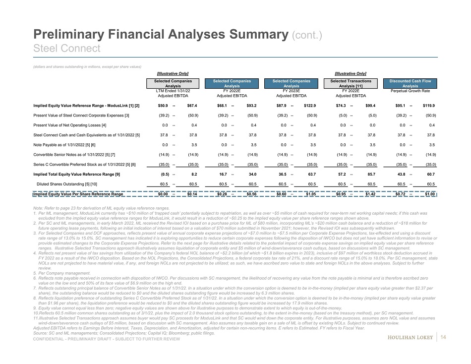 CONFIDENTIAL - PRELIMINARY DRAFT - SUBJECT TO FURTHER REVIEW $0.00 $0.28 $0.60 $0.95 $0.72 $0.14 $0.56 $1.05 $1.42 $1.00 Current Stock Price [1]: $1.29 Revised Proposal: $1.30 $0.00 $0.50 $1.00 $1.50 $2.00 Selected Companies Analysis LTM Ended 1/31/22 Adjusted EBITDA ML: 4.0x - 6.0x Selected Companies Analysis FY 2022E Adjusted EBITDA ML: 4.0x - 6.0x Selected Companies Analysis FY 2023E Adjusted EBITDA ML: 4.0x - 6.0x Selected Transactions Analysis FY 2022E Adjusted EBITDA ML: 4.5x - 6.5x Discounted Cash Flow Analysis ML Perpetual Growth Rate: 0.0% - 2.0% ML Discount Rate: 13.0% - 15.0% Implied Equity Value Per Share Reference Range Preliminary Financial Analyses Summary Steel Connect Implied Equity Value Per Share Reference Ranges Note: No particular weight was attributed to any analysis. 1. Based on closing stock price as of 3/31/22. Adjusted EBITDA refers to Earnings Before Interest, Taxes, Depreciation, and Amortization, adjusted for certain non - recurring it ems. E refers to Estimated. FY refers to Fiscal Year. Source: Refer to following page for additional details and sources. Illustrative Only Illustrative Only 13
