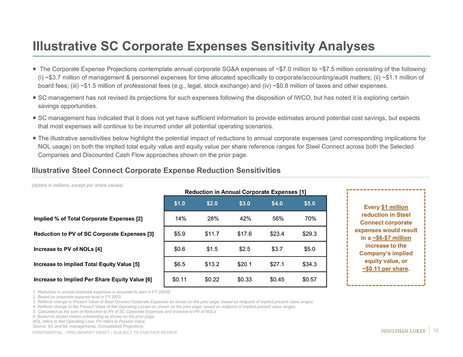 CONFIDENTIAL - PRELIMINARY DRAFT - SUBJECT TO FURTHER REVIEW Preliminary Financial Analyses Summary (cont.) Steel Connect (dollars and shares outstanding in millions, except per share values) Note: Refer to page 23 for derivation of ML equity value reference ranges. 1. Per ML management, ModusLink currently has ~$10 million of ‘trapped cash’ potentially subject to repatriation, as well as over ~$5 million of cash require d for near - term net working capital needs; if this cash was excluded from the implied equity value reference ranges for ModusLink , it would result in a reduction of ~$0.25 to the implied equity value per share reference ranges shown above. 2. Per SC and ML managements, in early March 2022, ML received the Revised IOI based on a purchase price for ML of $80 million, inc orporating ML’s ~$20 million cash balance and a reduction of ~$18 million for future operating lease payments, following an initial indication of interest based on a valuation of $70 million submitted in No vember 2021; however, the Revised IOI was subsequently withdrawn. 3. For Selected Companies and DCF approaches, reflects present value of annual corporate expense projections of ~$7.0 million to ~$ 7.5 million per Corporate Expense Projections, tax - effected and using a discount rate range of 13.0% to 15.0%. SC management has indicated it is exploring opportunities to reduce certain corporate expenses fol lowing the disposition of IWCO but does not yet have sufficient information to revise or provide estimated changes to the Corporate Expense Projections. Refer to the next page for illustrative details related to th e p otential impact of corporate expense savings on implied equity value per share reference ranges. Illustrative Selected Transactions approach illustratively assumes liquidation of corporate entity and $5 million of wi nd - down/severance cash outlays, based on discussions with SC management. 4. Reflects net present value of tax savings from utilization of the Company's federal NOL balance of ~$2.2 billion (of which ~$ 1.8 billion expires in 2023), inclusive of $97 million of worthless stock deduction accrued in FY 2022 as a result of the IWCO disposition. Based on the NOL Projections, the Consolidated Projections, a federal corporate tax rate of 21%, and a discount rate range of 15.0% to 18.0%. Per SC management, state NOLs are not projected to have material value, if any, and foreign NOLs are not projected to be utilized; as such, we have as cri bed zero value to state and foreign NOLs in the above analyses. Subject to further review. 5. Per Company management. 6. Reflects note payable received in connection with disposition of IWCO. Per discussions with SC management, the likelihood of rec overing any value from the note payable is minimal and is therefore ascribed zero value on the low end and 50% of its face value of $6.9 million on the high end. 7. Reflects outstanding principal balance of Convertible Senior Notes as of 1/31/22. In a situation under which the conversion o pti on is deemed to be in - the - money (implied per share equity value greater than $2.37 per share), the outstanding balance would be reduced to $0 and the diluted shares outstanding figure would be increased by 6.3 mi lli on shares. 8. Reflects liquidation preference of outstanding Series C Convertible Preferred Stock as of 1/31/22. In a situation under which th e conversion option is deemed to be in - the - money (implied per share equity value greater than $1.96 per share), the liquidation preference would be reduced to $0 and the diluted shares outstanding figure would be i ncr eased by 17.9 million shares. 9. Equity value cannot equal less than zero; negative equity values are shown above for illustrative purposes to demonstrate ext ent to which equity is out - of - the - money. 10. Reflects 60.5 million common shares outstanding as of 3/1/22, plus the impact of 2.0 thousand stock options outstanding, to t he extent in - the - money (based on the treasury method), per SC management. 11. Illustrative Selected Transactions approach assumes buyer would pay SC proceeds for ModusLink and that SC would wind down the corporate entity. For illustrative purposes, assumes zero NOL value and assumes wind - down/severance cash outlays of $5 million, based on discussion with SC management. Also assumes any taxable gain on a sale of ML is offset by existing NOLs. Subject to continued review. Adjusted EBITDA refers to Earnings Before Interest, Taxes, Depreciation, and Amortization, adjusted for certain non - recurring it ems. E refers to Estimated. FY refers to Fiscal Year. Source: SC and ML managements; Consolidated Projections; Capital IQ; Bloomberg; public filings. 14 [Illustrative Only] [Illustrative Only] Selected Companies Selected Companies Selected Companies Selected Transactions Discounted Cash Flow Analysis Analysis Analysis Analysis [11] Analysis LTM Ended 1/31/22 FY 2022E FY 2023E FY 2022E Perpetual Growth Rate Adjusted EBITDA Adjusted EBITDA Adjusted EBITDA Adjusted EBITDA 0.0% -- 2.0% Implied Equity Value Reference Range - ModusLink [1] [2] $50.9 -- $67.4 $68.1 -- $93.2 $87.9 -- $122.9 $74.3 -- $99.4 $95.1 -- $119.9 Present Value of Steel Connect Corporate Expenses [3] (39.2) -- (50.9) (39.2) -- (50.9) (39.2) -- (50.9) (5.0) -- (5.0) (39.2) -- (50.9) Present Value of Net Operating Losses [4] 0.0 -- 0.4 0.0 -- 0.4 0.0 -- 0.4 0.0 -- 0.0 0.0 -- 0.4 Steel Connect Cash and Cash Equivalents as of 1/31/2022 [5] 37.8 -- 37.8 37.8 -- 37.8 37.8 -- 37.8 37.8 -- 37.8 37.8 -- 37.8 Note Payable as of 1/31/2022 [5] [6] 0.0 -- 3.5 0.0 -- 3.5 0.0 -- 3.5 0.0 -- 3.5 0.0 -- 3.5 Convertible Senior Notes as of 1/31/2022 [5] [7] (14.9) -- (14.9) (14.9) -- (14.9) (14.9) -- (14.9) (14.9) -- (14.9) (14.9) -- (14.9) Series C Convertible Preferred Stock as of 1/31/2022 [5] [8] (35.0) -- (35.0) (35.0) -- (35.0) (35.0) -- (35.0) (35.0) -- (35.0) (35.0) -- (35.0) Implied Total Equity Value Reference Range [9] (0.5) -- 8.2 16.7 -- 
