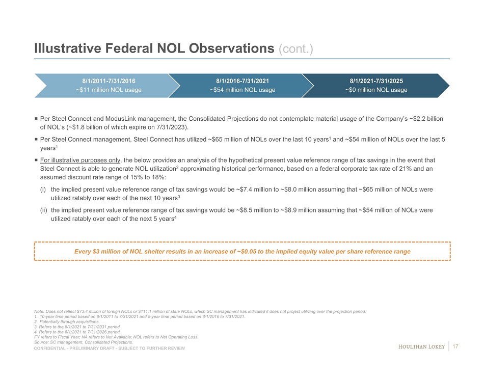 CONFIDENTIAL - PRELIMINARY DRAFT - SUBJECT TO FURTHER REVIEW Year Generated NOL Amount Maximum Tax Shelter [1] Expiration Date FY 2003 $1,786.0 $375.1 7/31/2023 FY 2004 $48.3 $10.2 7/31/2024 FY 2007 $19.4 $4.1 7/31/2027 FY 2008 $39.7 $8.3 7/31/2028 FY 2009 $4.8 $1.0 7/31/2029 FY 2011 $14.6 $3.1 7/31/2031 FY 2012 $5.3 $1.1 7/31/2032 FY 2013 $44.0 $9.2 7/31/2033 FY 2015 $12.7 $2.7 7/31/2035 FY 2016 $40.9 $8.6 7/31/2036 FY 2017 $13.1 $2.7 7/31/2037 FY 2018 $30.7 $6.4 7/31/2038 FY 2022 $97.0 $20.4 NA [3] Total $2,156.4 $452.8 Illustrative Federal NOL Observations Note: Does not reflect $73.4 million of foreign NOLs or $111.1 million of state NOLs, which SC management has indicated it do es not project utilizing over the projection period. 1. Calculated by multiplying corresponding gross NOL amount by the current federal tax rate of 21.0%. 2. Reflects $97 million worthless stock deduction from disposition of IWCO, per SC management. Additional NOLs may be generated in FY 2022 depending on final year - end results. 3. NOLs generated after FY 2018 are not expected to expire, per SC management. FY refers to Fiscal Year; NA refers to Not Available; NOL refers to Net Operating Loss. Source: SC management, Consolidated Projections. (dollars in millions) Every $3 million of NOL shelter results in an increase of ~$0.05 to the implied equity value per share reference range Schedule of Steel Connect Federal NOLs [2] 16