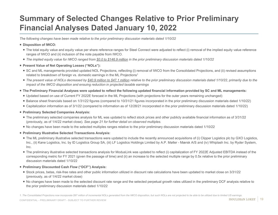 CONFIDENTIAL - PRELIMINARY DRAFT - SUBJECT TO FURTHER REVIEW Summary of Selected Changes Relative to Prior Preliminary Financial Analyses Dated January 10, 2022 The following changes have been made relative to the prior preliminary discussion materials dated 1/10/22 Disposition of IWCO: The total equity value and equity value per share reference ranges for Steel Connect were adjusted to reflect ( i ) removal of the implied equity value reference ranges of IWCO and (ii) inclusion of the note payable from IWCO. The implied equity value for IWCO ranged from $0.0 to $146.9 million in the prior preliminary discussion materials dated 1/10/22 Present Value of Net Operating Losses (“NOLs”): SC and ML managements provided updated NOL Projections, reflecting ( i ) removal of IWCO from the Consolidated Projections, and (ii) revised assumptions related to breakdown of foreign vs. domestic earnings in the ML Projections 1 The present value of NOLs decreased by $40.9 million to $47.1 million relative to the prior preliminary discussion materials dated 1/10/22, primarily due to the impact of the IWCO disposition and ensuing reduction in projected taxable earnings The Preliminary Financial Analyses were updated to reflect the following updated financial information provided by SC and ML man agements: Updated based on use of Current FY 2022E forecast in the ML Projections (with projections for the outer years remaining uncha nge d) Balance sheet financials based on 1/31/22 figures (compared to 10/31/21 figures incorporated in the prior preliminary discuss ion materials dated 1/10/22) Capitalization information as of 3/1/22 (compared to information as of 12/28/21 incorporated in the prior preliminary discuss ion materials dated 1/10/22) Preliminary Selected Companies Analysis: The preliminary selected companies analysis for ML was updated to reflect stock prices and other publicly available financial in formation as of 3/31/22 (previously, as of 1/4/22 market close). See page 21 for further detail on observed multiples. No changes have been made to the selected multiples ranges relative to the prior preliminary discussion materials dated 1/10/ 22 Preliminary Illustrative Selected Transactions Analysis: The ML preliminary illustrative selected transactions were updated to include the recently announced acquisitions of ( i ) Clipper Logistics plc by GXO Logistics, Inc., (ii) Kane Logistics, Inc. by ID Logistics Group SA, (iii) LF Logistics Holdings Limited by A.P. Møller - Mærsk A/S and (iv) Whiplash Inc. by Ryder System, Inc. The preliminary illustrative selected transactions analysis for ModusLink was updated to reflect ( i ) capitalization of FY 2022E Adjusted EBITDA instead of the corresponding metric for FY 2021 (given the passage of time) and (ii) an increase to the selected multiple range by 0.5x rela tiv e to the prior preliminary discussion materials dated 1/10/22 Preliminary Discounted Cash Flow (“DCF”) Analysis: Stock prices, betas, risk - free rates and other public information utilized in discount rate calculations have been updated to ma rket close on 3/31/22 (previously, as of 1/4/22 market close) No changes have been made to the selected discount rate range and the selected perpetual growth rates utilized in the prelimi nar y DCF analysis relative to the prior preliminary discussion materials dated 1/10/22 1. The Consolidated Projections now incorporate $97 million of incremental NOLs generated from the IWCO disposition, but such NO Ls are not projected to be able to be utilized due to limited US earnings . 19