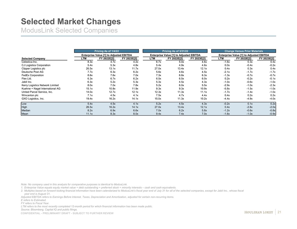 CONFIDENTIAL - PRELIMINARY DRAFT - SUBJECT TO FURTHER REVIEW Selected Market Changes ModusLink Selected Companies Note: No company used in this analysis for comparative purposes is identical to ModusLink. 1. Enterprise Value equals equity market value + debt outstanding + preferred stock + minority interests – cash and cash equivalent s. 2. Multiples based on forward looking financial information have been calendarized to ModusLink’s fiscal year end of July 31 for all of the selected companies, except for Jabil Inc., whose fiscal year end is August 31. Adjusted EBITDA refers to Earnings Before Interest, Taxes, Depreciation and Amortization, adjusted for certain non - recurring ite ms. E refers to Estimated. FY refers to Fiscal Year. LTM refers to the most recently completed 12 - month period for which financial information has been made public. Source: Bloomberg, Capital IQ and public filings. Pricing As of 1/4/22 Pricing As of 3/31/22 Change Versus Prior Materials Enterprise Value [1] to Adjusted EBITDA Enterprise Value [1] to Adjusted EBITDA Enterprise Value [1] to Adjusted EBITDA Selected Company LTM FY 2022E[2] FY 2023E[2] LTM FY 2022E[2] FY 2023E[2] LTM FY 2022E[2] FY 2023E[2] Celestica Inc. 8.3x 4.7x 4.2x 6.7x 5.0x 4.6x -1.6x 0.3x 0.4x CJ Logistics Corporation 5.4x 5.3x 4.8x 5.4x 4.9x 4.6x 0.0x -0.4x -0.2x Clipper Logistics plc 26.5x 13.1x 11.7x 27.0x 13.4x 12.1x 0.4x 0.3x 0.4x Deutsche Post AG 7.7x 6.3x 6.2x 5.6x 4.6x 4.5x -2.1x -1.7x -1.7x FedEx Corporation 8.6x 7.6x 7.0x 7.3x 6.8x 6.3x -1.3x -0.7x -0.7x Flex Ltd. 6.3x 6.7x 6.2x 6.5x 6.5x 6.0x 0.2x -0.2x -0.1x Jabil Inc. 6.3x 5.2x 5.3x 5.3x 4.5x 4.3x -1.0x -0.6x -1.0x Kerry Logistics Network Limited 8.0x 7.0x 7.8x 5.2x 6.0x 5.5x -2.9x -1.0x -2.3x Kuehne + Nagel International AG 15.1x 10.8x 11.9x 9.3x 9.3x 10.9x -5.8x -1.5x -1.0x United Parcel Service, Inc. 14.0x 12.7x 12.1x 12.3x 11.3x 11.1x -1.7x -1.4x -1.0x Wincanton plc 7.1x 4.5x 4.1x 7.5x 4.7x 4.4x 0.4x 0.2x 0.2x GXO Logistics, Inc. 19.4x 16.2x 14.1x 15.0x 11.3x 10.2x -4.4x -4.9x -4.0x Low 5.4x 4.5x 4.1x 5.2x 4.5x 4.3x -0.2x 0.1x 0.2x High 26.5x 16.2x 14.1x 27.0x 13.4x 12.1x 0.4x -2.8x -2.0x Median 8.2x 6.9x 6.6x 7.0x 6.2x 5.8x -1.2x -0.6x -0.8x Mean 11.1x 8.3x 8.0x 9.4x 7.4x 7.0x -1.6x -1.0x -0.9x 21
