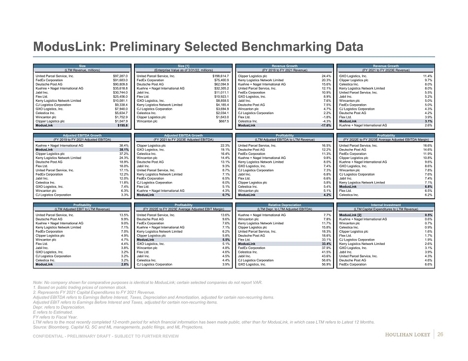 CONFIDENTIAL - PRELIMINARY DRAFT - SUBJECT TO FURTHER REVIEW ModusLink: Preliminary Selected Benchmarking Data Note: No company shown for comparative purposes is identical to ModusLink; certain selected companies do not report VAR. 1. Based on public trading prices of common stock. 2. Represents FY 2021 Capital Expenditures to FY 2021 Revenue. Adjusted EBITDA refers to Earnings Before Interest, Taxes, Depreciation and Amortization, adjusted for certain non - recurring ite ms. Adjusted EBIT refers to Earnings Before Interest and Taxes, adjusted for certain non - recurring items. Depr. refers to Depreciation. E refers to Estimated. FY refers to Fiscal Year. LTM refers to the most recently completed 12 - month period for which financial information has been made public, other than for M odusLink, in which case LTM refers to Latest 12 Months. Source: Bloomberg, Capital IQ, SC and ML managements, public filings, and ML Projections. Size Size [1] Revenue Growth Revenue Growth (LTM Revenue, millions) (Enterprise Value as of 3/31/22, millions) (FY 2019 to FY 2021 Revenue) (FY 2021 to FY 2023E Revenue) Name Value Name Value Name Value Name Value United Parcel Service, Inc. $97,287.0 United Parcel Service, Inc. $198,614.7 Clipper Logistics plc 24.4% GXO Logistics, Inc. 11.4% FedEx Corporation $91,683.0 FedEx Corporation $75,400.9 Kerry Logistics Network Limited 20.3% Clipper Logistics plc 9.7% Deutsche Post AG $90,809.8 Deutsche Post AG $62,094.9 Kuehne + Nagel International AG 15.6% Celestica Inc. 8.0% Kuehne + Nagel International AG $35,618.8 Kuehne + Nagel International AG $32,305.2 United Parcel Service, Inc. 12.1% Kerry Logistics Network Limited 8.0% Jabil Inc. $30,744.0 Jabil Inc. $11,011.1 FedEx Corporation 10.9% United Parcel Service, Inc. 5.5% Flex Ltd. $25,456.0 Flex Ltd. $10,923.1 GXO Logistics, Inc. 8.9% Jabil Inc. 5.2% Kerry Logistics Network Limited $10,081.1 GXO Logistics, Inc. $8,858.5 Jabil Inc. 7.6% Wincanton plc 5.0% CJ Logistics Corporation $9,338.4 Kerry Logistics Network Limited $4,185.4 Deutsche Post AG 7.5% FedEx Corporation 5.0% GXO Logistics, Inc. $7,940.0 CJ Logistics Corporation $3,694.9 Wincanton plc 4.7% CJ Logistics Corporation 4.3% Celestica Inc. $5,634.7 Celestica Inc. $2,034.1 CJ Logistics Corporation 2.2% Deutsche Post AG 4.2% Wincanton plc $1,752.9 Clipper Logistics plc $1,643.0 Flex Ltd. -1.8% Flex Ltd. 3.9% Clipper Logistics plc $1,047.9 Wincanton plc $667.5 Celestica Inc. -4.3% ModusLink 3.1% ModusLink $195.8 ModusLink -17.6% Kuehne + Nagel International AG 2.6% Adjusted EBITDA Growth Adjusted EBITDA Growth Profitability Profitability (FY 2019 to FY 2021 Adjusted EBITDA) (FY 2021 to FY 2023E Adjusted EBITDA) (LTM Adjusted EBITDA to LTM Revenue) (FY 2022E to FY 2023E Average Adjusted EBITDA Margin) Name Value Name Value Name Value Name Value Kuehne + Nagel International AG 38.4% Clipper Logistics plc 22.3% United Parcel Service, Inc. 16.5% United Parcel Service, Inc. 16.6% ModusLink 38.1% GXO Logistics, Inc. 19.1% Deutsche Post AG 12.2% Deutsche Post AG 14.6% Clipper Logistics plc 37.2% Celestica Inc. 16.4% FedEx Corporation 11.3% FedEx Corporation 11.9% Kerry Logistics Network Limited 24.3% Wincanton plc 14.4% Kuehne + Nagel International AG 9.8% Clipper Logistics plc 10.8% Deutsche Post AG 18.9% Deutsche Post AG 13.1% Kerry Logistics Network Limited 8.0% Kuehne + Nagel International AG 9.6% Flex Ltd. 18.0% Jabil Inc. 9.3% GXO Logistics, Inc. 7.4% GXO Logistics, Inc. 8.6% United Parcel Service, Inc. 17.1% United Parcel Service, Inc. 8.7% CJ Logistics Corporation 7.3% Wincanton plc 7.8% FedEx Corporation 12.2% Kerry Logistics Network Limited 7.1% Jabil Inc. 6.8% CJ Logistics Corporation 7.6% Jabil Inc. 12.0% FedEx Corporation 6.5% Flex Ltd. 6.6% Jabil Inc. 7.4% Celestica Inc. 11.8% CJ Logistics Corporation 6.0% Clipper Logistics plc 5.8% Kerry Logistics Network Limited 7.1% GXO Logistics, Inc. 7.4% Flex Ltd. 5.1% Celestica Inc. 5.4% ModusLink 6.8% Wincanton plc 6.3% Kuehne + Nagel International AG 4.3% Wincanton plc 5.1% Flex Ltd. 6.5% CJ Logistics Corporation 3.3% ModusLink 0.7% ModusLink 4.2% Celestica Inc. 6.2% Profitability Profitability Relative Depreciation Internal Investment (LTM Adjusted EBIT to LTM Revenue) (FY 2022E to FY 2023E Average Adjusted EBIT Margin) (LTM Depr. to LTM Adjusted EBITDA) (LTM Capital Expenditures to LTM Revenue) Name Value Name Value Name Value Name Value United Parcel Service, Inc. 13.5% United Parcel Service, Inc. 13.6% Kuehne + Nagel International AG 7.7% ModusLink [2] 0.5% Deutsche Post AG 9.9% Deutsche Post AG 9.6% Wincanton plc 7.8% Kuehne + Nagel International AG 0.6% Kuehne + Nagel International AG 9.0% FedEx Corporation 7.6% Kerry Logistics Network Limited 11.7% Wincanton plc 0.7% Kerry Logistics Network Limited 7.1% Kuehne + Nagel International AG 7.1% Clipper Logistics plc 15.8% Celestica Inc. 0.9% FedEx Corporation 7.0% Kerry Logistics Network Limited 6.2% United Parcel Service, Inc. 18.3% Clipper Logistics plc 1.6% Clipper Logistics plc 4.9% Clipper Logistics plc 5.8% Deutsche Post AG 18.6% Flex Ltd. 1.7% Wincanton plc 4.7% ModusLink 5.5% Flex Ltd. 33.1% CJ Logistics Corporation 1.9% Flex Ltd. 4.4% GXO Logistics, Inc. 5.1% ModusLink 33.4% Kerry Logistics Network Limited 2.6% Jabil Inc. 3.8% Wincanton plc 4.8% FedEx Corporation 37.9% GXO Logistics, Inc. 3.1% GXO Logistics, Inc. 3.2% Flex Ltd. 4.6% Celestica Inc. 41.5% Jabil Inc. 3.9% CJ Logistics Corporation 3.2% Jabil Inc. 4.5% Jabil Inc. 43.6% United Parcel Service, Inc. 4.3% Celestica Inc. 3.2% Celestica Inc. 4.4% CJ Logistics Corporation 56.6% Deutsche Post AG 4.6% ModusLink 2.8% CJ Logistics Corporation 3.9% GXO Logistics, Inc. 56.9% FedEx Corporation 6.6% 26