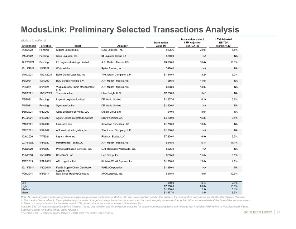CONFIDENTIAL - PRELIMINARY DRAFT - SUBJECT TO FURTHER REVIEW ModusLink: Preliminary Selected Transactions Analysis Note: No company used in this analysis for comparative purposes is identical to ModusLink, and no transaction used in this an aly sis for comparative purposes is identical to the Revised Proposal. 1. Transaction Value refers to the implied enterprise value of target company, based on the announced transaction equity pric e a nd other public information available at the time of the announcement. 2. Based on reported metric for the most recent LTM period prior to the announcement of the transaction. Adjusted EBITDA refers to Earnings Before Interest, Taxes, Depreciation and Amortization, adjusted for certain non - recurring ite ms. NA refers to Not Available. NMF refers to Not Meaningful Figure. Sources: Capital IQ, public filings, press releases. (dollars in millions) Transaction Value / LTM Adjusted Transaction LTM Adjusted EBITDA Announced Effective Target Acquiror Value [1] EBITDA [2] Margin % [2] CLGPending Clipper Logistics plc GXO Logistics, Inc. $925.6 # 20.0x 5.8% KLIPending Kane Logistics, Inc. ID Logistics Group SA $240.0 # NANA NA LFLPending LF Logistics Holdings Limited A.P. Møller - Mærsk A/S $3,860.0 # 16.4x 18.1% WHIP1/1/2022 Whiplash Inc. Ryder System, Inc. $480.0 # NANA NA ECHO11/23/2021 Echo Global Logistics, Inc The Jordan Company, L.P. $1,340.4 # 13.2x 3.2% BCEH10/1/2021 B2C Europe Holding B.V. A.P. Møller - Mærsk A/S $86.0 # 11.0x NA VSCM8/6/2021 Visible Supply Chain Management, LLC A.P. Møller - Mærsk A/S $838.0 # 13.0x NA Trans11/15/2021 Transplace Inc Uber Freight LLC $2,250.0 # NMFNMF NA IPLPending Imperial Logistics Limited DP World Limited $1,237.4 # 6.1x 5.6% Syncreon Syncreon.Us Inc. DP World Limited $1,200.0 NA NA 6/30/2021 Quad Logistics Services, LLC Mullen Group Ltd. $40.0 8.0x NA AGI Agility Global Integrated Logistics DSV Panalpina A/S $4,200.0 16.3x 6.4% Lasership Lasership, Inc. American Securities LLC $1,700.0 13.0x NA AIT AIT Worldwide Logistics, Inc. The Jordan Company, L.P. $1,200.0 NA NA Ingram Ingram Micro Inc. Platinum Equity, LLC $7,200.0 6.9x 2.3% Performance Performance Team LLC A.P. Møller - Mærsk A/S $545.0 6.1x 17.1% PDS Prime Distribution Services, Inc. C.H. Robinson Worldwide, Inc. $225.0 NA NA CaseStack CaseStack, Inc. Hub Group, Inc. $255.0 11.6x 9.1% APL APL Logistics Ltd Kintetsu World Express, Inc. $1,200.0 15.0x 4.8% FSCDS FedEx Supply Chain Distribution System, Inc. FedEx Corporation $1,380.0 NA NA New Breed New Breed Holding Company XPO Logistics, Inc. $615.0 8.0x 12.9% Low $40.0 6.1x 2.3% High $7,200.0 20.0x 18.1% Median $1,200.0 12.3x 6.1% Mean $1,477.0 11.8x 8.5% 1/30/2015 9/2/2014 3/2/2020 7/7/2021 1/4/2020 12/3/2018 5/29/2015 12/9/2020 02/19/2020 1/28/2020 11/5/2018 2/17/2015 12/15/2014 7/29/2014 5/12/2021 3/17/2021 3/17/2021 7/1/2021 Pending 4/27/2021 8/16/2021 6/30/2021 7/8/2021 8/6/2021 8/6/2021 9/10/2021 5/12/2021 2/20/2022 2/14/2022 12/22/2021 12/13/2021 7/22/2021 27