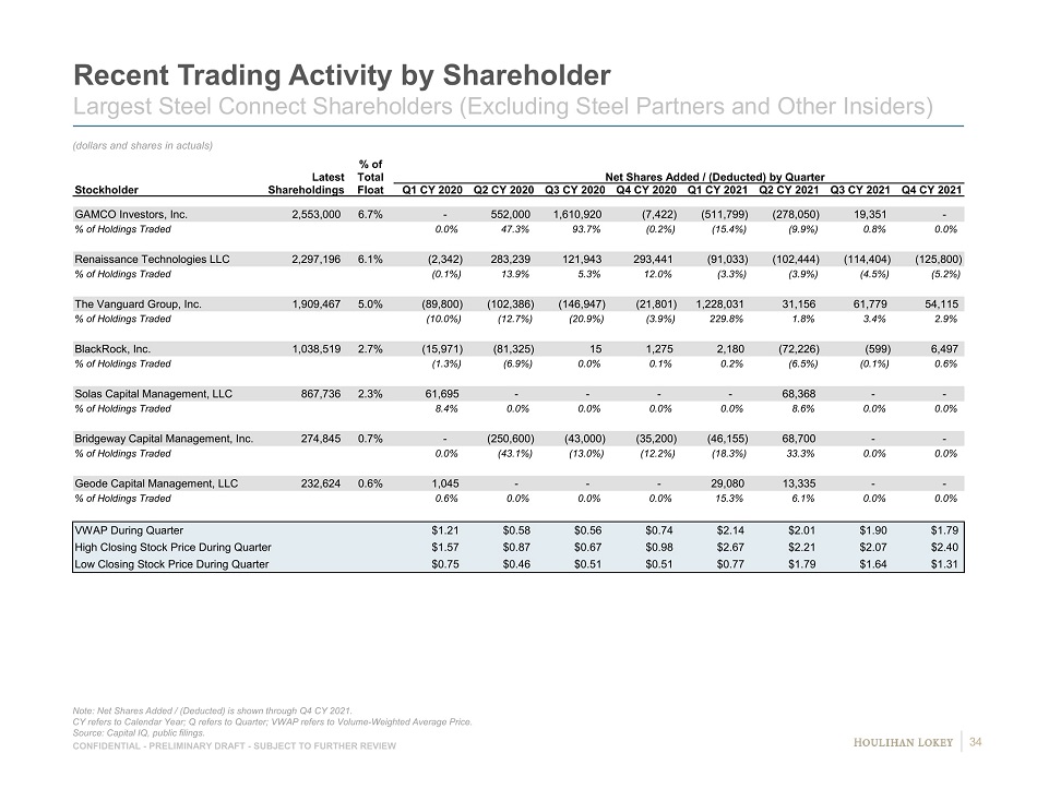 CONFIDENTIAL - PRELIMINARY DRAFT - SUBJECT TO FURTHER REVIEW Recent Trading Activity by Shareholder Largest Steel Connect Shareholders (Excluding Steel Partners and Other Insiders) Note: Net Shares Added / (Deducted) is shown through Q4 CY 2021. CY refers to Calendar Year; Q refers to Quarter; VWAP refers to Volume - Weighted Average Price. Source: Capital IQ, public filings. (dollars and shares in actuals) % of Latest Total Net Shares Added / (Deducted) by Quarter Stockholder Shareholdings Float Q1 CY 2020 Q2 CY 2020 Q3 CY 2020 Q4 CY 2020 Q1 CY 2021 Q2 CY 2021 Q3 CY 2021 Q4 CY 2021 GAMCO Investors, Inc. 2,553,000 6.7% - 552,000 1,610,920 (7,422) (511,799) (278,050) 19,351 - % of Holdings Traded 0.0% 47.3% 93.7% (0.2%) (15.4%) (9.9%) 0.8% 0.0% Renaissance Technologies LLC 2,297,196 6.1% (2,342) 283,239 121,943 293,441 (91,033) (102,444) (114,404) (125,800) % of Holdings Traded (0.1%) 13.9% 5.3% 12.0% (3.3%) (3.9%) (4.5%) (5.2%) The Vanguard Group, Inc. 1,909,467 5.0% (89,800) (102,386) (146,947) (21,801) 1,228,031 31,156 61,779 54,115 % of Holdings Traded (10.0%) (12.7%) (20.9%) (3.9%) 229.8% 1.8% 3.4% 2.9% BlackRock, Inc. 1,038,519 2.7% (15,971) (81,325) 15 1,275 2,180 (72,226) (599) 6,497 % of Holdings Traded (1.3%) (6.9%) 0.0% 0.1% 0.2% (6.5%) (0.1%) 0.6% Solas Capital Management, LLC 867,736 2.3% 61,695 - - - - 68,368 - - % of Holdings Traded 8.4% 0.0% 0.0% 0.0% 0.0% 8.6% 0.0% 0.0% Bridgeway Capital Management, Inc. 274,845 0.7% - (250,600) (43,000) (35,200) (46,155) 68,700 - - % of Holdings Traded 0.0% (43.1%) (13.0%) (12.2%) (18.3%) 33.3% 0.0% 0.0% Geode Capital Management, LLC 232,624 0.6% 1,045 - - - 29,080 13,335 - - % of Holdings Traded 0.6% 0.0% 0.0% 0.0% 15.3% 6.1% 0.0% 0.0% VWAP During Quarter $1.21 $0.58 $0.56 $0.74 $2.14 $2.01 $1.90 $1.79 High Closing Stock Price During Quarter $1.57 $0.87 $0.67 $0.98 $2.67 $2.21 $2.07 $2.40 Low Closing Stock Price During Quarter $0.75 $0.46 $0.51 $0.51 $0.77 $1.79 $1.64 $1.31 34