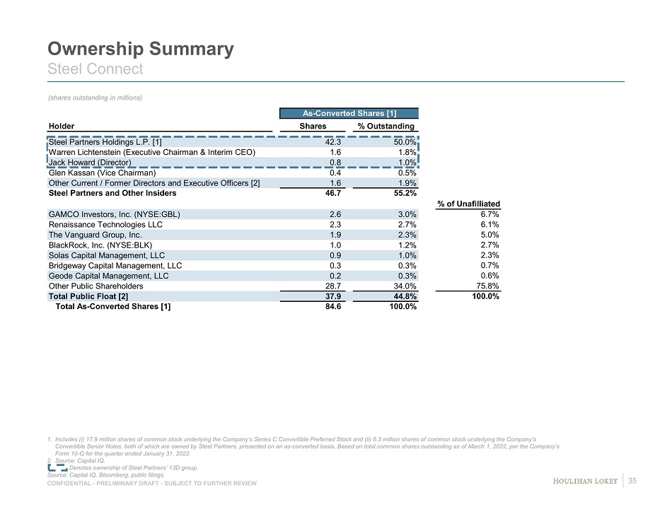 CONFIDENTIAL - PRELIMINARY DRAFT - SUBJECT TO FURTHER REVIEW Ownership Summary Steel Connect 1. Includes (i) 17.9 million shares of common stock underlying the Company’s Series C Convertible Preferred Stock and (ii) 6.3 m ill ion shares of common stock underlying the Company’s Convertible Senior Notes, both of which are owned by Steel Partners, presented on an as - converted basis. Based on total common s hares outstanding as of March 1, 2022, per the Company’s Form 10 - Q for the quarter ended January 31, 2022. 2. Source: Capital IQ. Denotes ownership of Steel Partners’ 13D group. Source: Capital IQ, Bloomberg, public filings. (shares outstanding in millions) As-Converted Shares [1] Holder Shares % Outstanding Steel Partners Holdings L.P. [1] 42.3 50.0% Warren Lichtenstein (Executive Chairman & Interim CEO) 1.6 1.8% Jack Howard (Director) 0.8 1.0% Glen Kassan (Vice Chairman) 0.4 0.5% Other Current / Former Directors and Executive Officers [2] 1.6 1.9% Steel Partners and Other Insiders 46.7 55.2% GAMCO Investors, Inc. (NYSE:GBL) 2.6 3.0% 6.7% Renaissance Technologies LLC 2.3 2.7% 6.1% The Vanguard Group, Inc. 1.9 2.3% 5.0% BlackRock, Inc. (NYSE:BLK) 1.0 1.2% 2.7% Solas Capital Management, LLC 0.9 1.0% 2.3% Bridgeway Capital Management, LLC 0.3 0.3% 0.7% Geode Capital Management, LLC 0.2 0.3% 0.6% Other Public Shareholders 28.7 34.0% 75.8% Total Public Float [2] 37.9 44.8% 100.0% Total As-Converted Shares [1] 84.6 100.0% % of Unafilliated 35