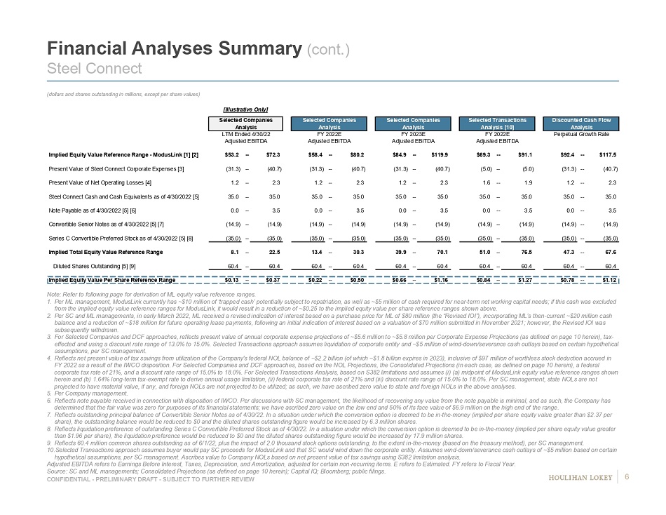 CONFIDENTIAL - PRELIMINARY DRAFT - SUBJECT TO FURTHER REVIEW Financial Analyses Summary (cont.) Steel Connect (dollars and shares outstanding in millions, except per share values) Note: Refer to following page for derivation of ML equity value reference ranges. 1. Per ML management, ModusLink currently has ~$10 million of ‘trapped cash’ potentially subject to repatriation, as well as ~$5 mi llion of cash required for near - term net working capital needs; if this cash was excluded from the implied equity value reference ranges for ModusLink, it would result in a reduction of ~$0.25 to the implied equity val ue per share reference ranges shown above. 2. Per SC and ML managements, in early March 2022, ML received a revised indication of interest based on a purchase price for ML of $80 million (the “Revised IOI”), incorporating ML’s then - current ~$20 million cash balance and a reduction of ~$18 million for future operating lease payments, following an initial indication of interest base d o n a valuation of $70 million submitted in November 2021; however, the Revised IOI was subsequently withdrawn. 3. For Selected Companies and DCF approaches, reflects present value of annual corporate expense projections of ~$5.6 million to ~$ 5.8 million per Corporate Expense Projections (as defined on page 10 herein), tax - effected and using a discount rate range of 13.0% to 15.0%. Selected Transactions approach assumes liquidation of corporate e nti ty and ~$5 million of wind - down/severance cash outlays based on certain hypothetical assumptions, per SC management. 4. Reflects net present value of tax savings from utilization of the Company's federal NOL balance of ~$2.2 billion (of which ~$ 1.8 billion expires in 2023), inclusive of $97 million of worthless stock deduction accrued in FY 2022 as a result of the IWCO disposition. For Selected Companies and DCF approaches, based on the NOL Projections, the Con sol idated Projections (in each case, as defined on page 10 herein), a federal corporate tax rate of 21%, and a discount rate range of 15.0% to 18.0%. For Selected Transactions Analysis, based on S382 lim ita tions and assumes ( i ) (a) midpoint of ModusLink equity value reference ranges shown herein and (b) 1.64% long - term tax - exempt rate to derive annual usage limitation, (ii) federal corporate tax rate of 21% and (ii i) discount rate range of 15.0% to 18.0%. Per SC management, state NOLs are not projected to have material value, if any, and foreign NOLs are not projected to be utilized; as such, we have ascribed zero v alu e to state and foreign NOLs in the above analyses. 5. Per Company management. 6. Reflects note payable received in connection with disposition of IWCO. Per discussions with SC management, the likelihood of rec overing any value from the note payable is minimal, and as such, the Company has determined that the fair value was zero for purposes of its financial statements; we have ascribed zero value on the low end and 50% of its face value of $6.9 million on the high end of the range. 7. Reflects outstanding principal balance of Convertible Senior Notes as of 4/30/22. In a situation under which the conversion o pti on is deemed to be in - the - money (implied per share equity value greater than $2.37 per share), the outstanding balance would be reduced to $0 and the diluted shares outstanding figure would be increased by 6.3 mi lli on shares. 8. Reflects liquidation preference of outstanding Series C Convertible Preferred Stock as of 4/30/22. In a situation under which th e conversion option is deemed to be in - the - money (implied per share equity value greater than $1.96 per share), the liquidation preference would be reduced to $0 and the diluted shares outstanding figure would be i ncr eased by 17.9 million shares. 9. Reflects 60.4 million common shares outstanding as of 6/1/22, plus the impact of 2.0 thousand stock options outstanding, to t he extent in - the - money (based on the treasury method), per SC management. 10. Selected Transactions approach assumes buyer would pay SC proceeds for ModusLink and that SC would wind down the corporate entity. Assumes wind - down/severance cash outlays of ~$5 million based on certain hypothetical assumptions, per SC management. Ascribes value to Company NOLs based on net present value of tax savings using S 382 limitation analysis. Adjusted EBITDA refers to Earnings Before Interest, Taxes, Depreciation, and Amortization, adjusted for certain non - recurring it ems. E refers to Estimated. FY refers to Fiscal Year. Source: SC and ML managements; Consolidated Projections (as defined on page 10 herein); Capital IQ; Bloomberg; public filings . [Illustrative Only] Selected Companies Selected Companies Selected Companies Selected Transactions Discounted Cash Flow Analysis Analysis Analysis Analysis [10] Analysis LTM Ended 4/30/22 FY 2022E FY 2023E FY 2022E Perpetual Growth Rate Adjusted EBITDA Adjusted EBITDA Adjusted EBITDA Adjusted EBITDA 0.0% -- 2.0% Implied Equity Value Reference Range - ModusLink [1] [2] $53.2 -- $72.3 $58.4 -- $80.2 $84.9 -- $119.9 $69.3 -- $91.1 $92.4 -- $117.5 Present Value of Steel Connect Corporate Expenses [3] (31.3) -- (40.7) (31.3) -- (40.7) (31.3) -- (40.7) (5.0) -- (5.0) (31.3) -- (40.7) Present Value of Net Operating Losses [4] 1.2 -- 2.3 1.2 -- 2.3 1.2 -- 2.3 1.6 -- 1.9 1.2 -- 2.3 Steel Connect Cash and Cash Equivalents as of 4/30/2022 [5] 35.0 -- 35.0 35.0 -- 35.0 35.0 -- 35.0 35.0 -- 35.0 35.0 -- 35.0 Note Payable as of 4/30/2022 [5] [6] 0.0 -- 3.5 0.0 -- 3.5 0.0 -- 3.5 0.0 -- 3.5 0.0 -- 3.5 Convertible Senior Notes as of 4/30/2022 [5] [7] (14.9) -- (14.9) (14.9) -- (14.9) (14.9) -- (14.9) (14.9) -- (14.9) (14.9) -- (14.9) Series C Convertible Preferred Stock as of 4/30/2022 [5] [8] (35.0) -- (35.0) (35.0) -- (35.0) (35.0) -- (35.0) (35.0) -- (35.0) (35.0) -- (35.0) Implied Total Equity Value Reference Range 8.1 -- 22.5 13.4 -- 30.3 39.9 -- 70.1 51.0 -- 76.5 47.3 -- 67.6 Diluted Shares Ou