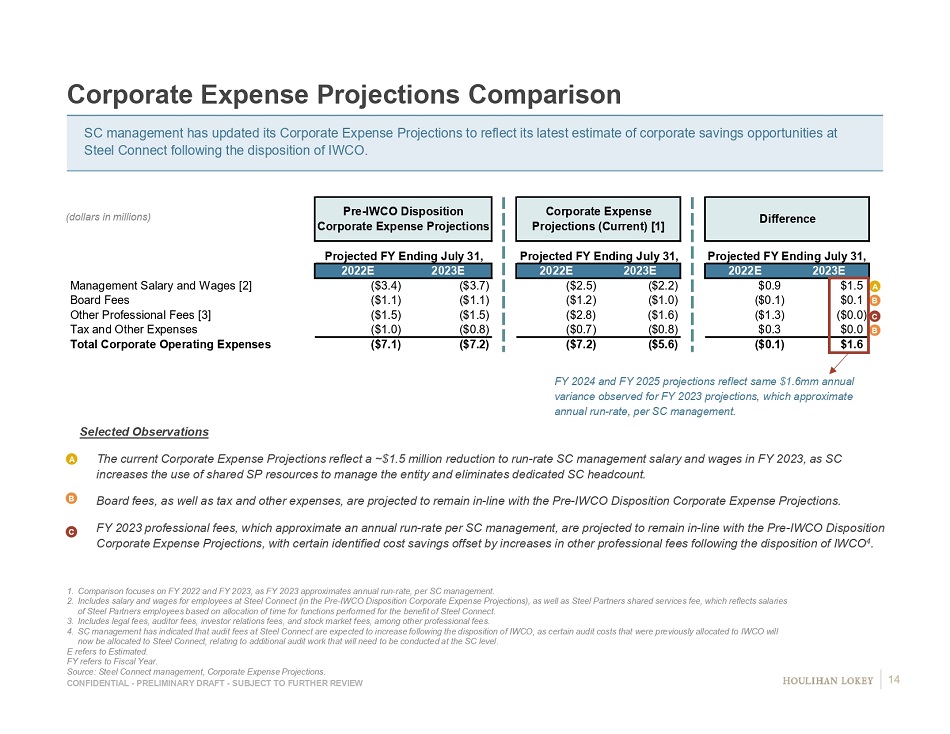 CONFIDENTIAL - PRELIMINARY DRAFT - SUBJECT TO FURTHER REVIEW Projected FY Ending July 31, Projected FY Ending July 31, Projected FY Ending July 31, 2022E 2023E 2022E 2023E 2022E 2023E Management Salary and Wages [2] ($3.4) ($3.7) ($2.5) ($2.2) $0.9 $1.5 Board Fees ($1.1) ($1.1) ($1.2) ($1.0) ($0.1) $0.1 Other Professional Fees [3] ($1.5) ($1.5) ($2.8) ($1.6) ($1.3) ($0.0) Tax and Other Expenses ($1.0) ($0.8) ($0.7) ($0.8) $0.3 $0.0 Total Corporate Operating Expenses ($7.1) ($7.2) ($7.2) ($5.6) ($0.1) $1.6 Pre-IWCO Disposition Corporate Expense Projections Corporate Expense Projections (Current) [1] Difference Corporate Expense Projections Comparison 1. Comparison focuses on FY 2022 and FY 2023, as FY 2023 approximates annual run - rate, per SC management. 2. Includes salary and wages for employees at Steel Connect (in the Pre - IWCO Disposition Corporate Expense Projections), as well as Steel Partners shared services fee, which reflects salaries of Steel Partners employees based on allocation of time for functions performed for the benefit of Steel Connect. 3. Includes legal fees, auditor fees, investor relations fees, and stock market fees, among other professional fees. 4. SC management has indicated that audit fees at Steel Connect are expected to increase following the disposition of IWCO, as c ert ain audit costs that were previously allocated to IWCO will now be allocated to Steel Connect, relating to additional audit work that will need to be conducted at the SC level. E refers to Estimated. FY refers to Fiscal Year. Source: Steel Connect management, Corporate Expense Projections. (dollars in millions) A Selected Observations The current Corporate Expense Projections reflect a ~$1.5 million reduction to run - rate SC management salary and wages in FY 202 3, as SC increases the use of shared SP resources to manage the entity and eliminates dedicated SC headcount. Board fees, as well as tax and other expenses, are projected to remain in - line with the Pre - IWCO Disposition Corporate Expense P rojections. FY 2023 professional fees, which approximate an annual run - rate per SC management, are projected to remain in - line with the Pre - IWCO Disposition Corporate Expense Projections, with certain identified cost savings offset by increases in other professional fees following the disposition of IWCO 4 . B C A B C B SC management has updated its Corporate Expense Projections to reflect its latest estimate of corporate savings opportunities at Steel Connect following the disposition of IWCO. FY 2024 and FY 2025 projections reflect same $1.6mm annual variance observed for FY 2023 projections, which approximate annual run - rate, per SC management. 8