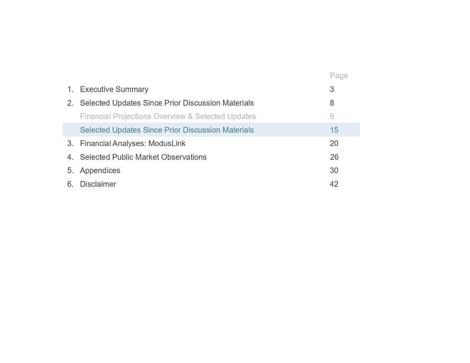 Page 1. Executive Summary 3 2. Selected Updates Since Prior Discussion Materials 8 Financial Projections Overview & Selected Updates 9 Selected Updates Since Prior Discussion Materials 15 3. Financial Analyses: ModusLink 20 4. Selected Public Market Observations 26 5. Appendices 30 6. Disclaimer 42