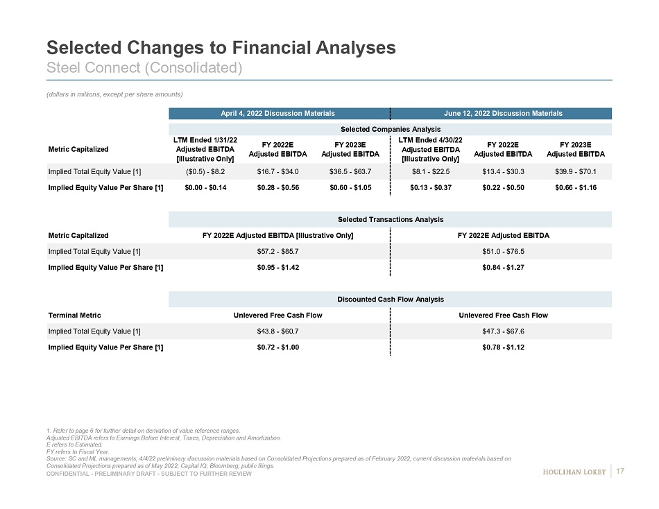 CONFIDENTIAL - PRELIMINARY DRAFT - SUBJECT TO FURTHER REVIEW Summary of Selected Changes Relative to Prior Preliminary Financial Analyses Dated April 4, 2022 The following changes have been made relative to the prior preliminary discussion materials dated 4/4/22 Corporate Expense Projections and NOL Projections 1 : SC management provided updated Corporate Expense Projections reflecting its latest estimate of corporate savings opportunitie s a t Steel Connect following the disposition of IWCO, as well as updated NOL Projections reflecting such revised Corporate Expense Proje cti ons The present value of Steel Connect Corporate Expenses decreased by $7.9 million to $10.2 million relative to the prior preliminary discussion materials dated 4/4/22 The present value of NOLs increased by $1.2 million to $1.8 million relative to the prior preliminary discussion materials dated 4/4/22 The Financial Analyses were updated to reflect the following additional updated financial information provided by SC and ML managements: Current FY 2022E forecast in the ML Projections (with projections for the outer years remaining unchanged) Financial information (including LTM Adjusted EBITDA and balance sheet items) based on 4/30/22 figures (compared to 1/31/22 f igu res incorporated in the prior preliminary discussion materials dated 4/4/22) Capitalization information as of 6/1/22 (compared to information as of 3/1/22 incorporated in the prior preliminary discussio n m aterials dated 4/4/22) Selected Companies Analysis: The selected companies analysis for ML was updated to reflect stock prices and other publicly available financial information as of 6/9/22 (previously, as of 3/31/22 market close). See page 19 for further detail on observed multiples. Clipper Logistics plc was removed from the selected companies, due to the closing of its announced sale to GXO Logistics, Inc . No changes have been made to the selected multiples ranges relative to the prior preliminary discussion materials dated 4/4/2 2 Selected Transactions Analysis: The ML selected transactions were updated to include the recently announced acquisition of the Intermodal Business of XPO Log ist ics Inc. by STG Logistics, Inc. The selected transactions analysis for ModusLink was updated to reflect an increase to the selected multiple range by 0.5x re lat ive to the prior preliminary discussion materials dated 4/4/22 Discounted Cash Flow (“DCF”) Analysis: Stock prices, betas, risk - free rates and other public information utilized in discount rate calculations have been updated to ma rket close on 6/9/22 (previously, as of 3/31/22 market close) No changes have been made to the selected discount rate range and the selected perpetual growth rates utilized in the DCF ana lys is relative to the prior preliminary discussion materials dated 4/4/22 1. Utilized in the Selected Companies and DCF approaches. 16