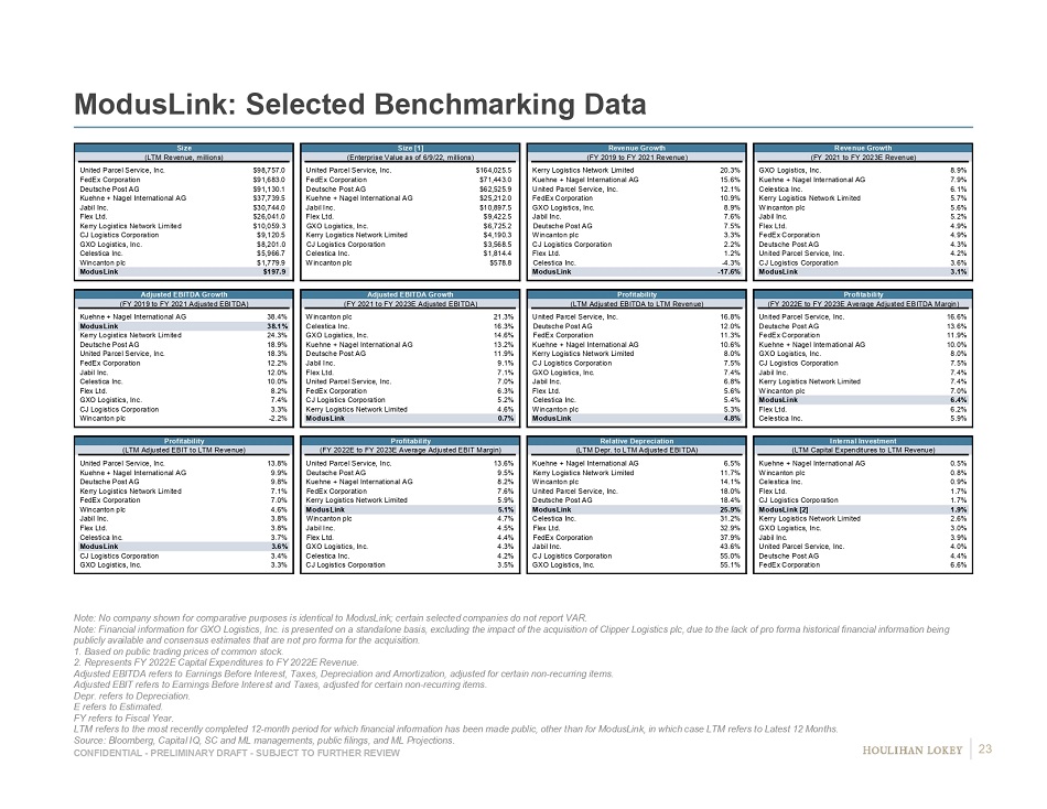 CONFIDENTIAL - PRELIMINARY DRAFT - SUBJECT TO FURTHER REVIEW ModusLink: Selected Companies Analysis (dollars in millions, except per share values) Note: No company used in this analysis for comparative purposes is identical to ModusLink. 1. Enterprise Value equals equity market value + debt outstanding + preferred stock + minority interests – cash and cash equivalent s. 2. Based on closing prices as of 6/9/22. 3. Based on diluted shares. 4. Multiples based on forward looking financial information have been calendarized to ModusLink’s fiscal year end of July 31 for al l of the selected companies, except for Jabil Inc., whose fiscal year end is August 31. 5. Financial information for GXO Logistics, Inc. is presented on a standalone basis, excluding the impact of the acquisition of Cli pper Logistics plc, due to the lack of pro forma historical financial information being publicly available and consensus estimates that are not pro forma for the acquisition. Adjusted EBITDA refers to Earnings Before Interest, Taxes, Depreciation and Amortization, adjusted for certain non - recurring ite ms. E refers to Estimated. FY refers to Fiscal Year. LTM refers to the most recently completed 12 - month period for which financial information has been made public. Source: Bloomberg, Capital IQ and public filings. Share Equity Market Enterprise Enterprise Value [1] to Adjusted EBITDA Selected Company Price [2] Value [2,3] Value [2,3] LTM FY 2022E [4] FY 2023E [4] Celestica Inc. $11.02 $1,509.7 $1,814.4 5.7x 5.3x 4.2x CJ Logistics Corporation $95.90 $1,912.7 $3,568.5 5.2x 5.3x 4.8x Deutsche Post AG $38.15 46,619.7 62,525.9 5.7x 5.4x 4.8x FedEx Corporation $217.00 56,999.0 71,443.0 6.9x 6.5x 6.0x Flex Ltd. $16.85 8,111.5 9,422.5 6.4x 6.0x 5.1x GXO Logistics, Inc. [5] $52.12 6,064.2 6,725.2 11.2x 10.4x 8.7x Jabil Inc. $60.97 9,108.5 10,897.5 5.2x 4.5x 4.3x Kerry Logistics Network Limited $2.30 4,160.4 4,190.3 5.2x 5.3x 5.9x Kuehne + Nagel International AG $231.99 27,944.9 25,212.0 6.3x 6.8x 7.1x United Parcel Service, Inc. $176.55 154,671.5 164,025.5 9.9x 9.9x 9.4x Wincanton plc $4.65 583.4 578.8 6.1x 5.2x 3.9x Low 5.2x 4.5x 3.9x High 11.2x 10.4x 9.4x Median 6.1x 5.4x 5.1x Mean 6.7x 6.4x 5.8x 22