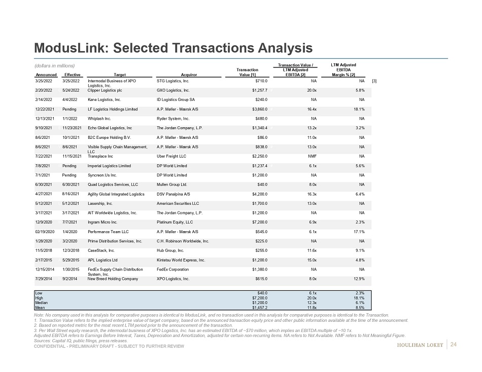 CONFIDENTIAL - PRELIMINARY DRAFT - SUBJECT TO FURTHER REVIEW ModusLink : Selected Transactions Analysis Note: No company used in this analysis for comparative purposes is identical to ModusLink, and no transaction used in this an aly sis for comparative purposes is identical to the Transaction. 1. Transaction Value refers to the implied enterprise value of target company, based on the announced transaction equity pric e a nd other public information available at the time of the announcement. 2. Based on reported metric for the most recent LTM period prior to the announcement of the transaction. 3. Per Wall Street equity research, the intermodal business of XPO Logistics, Inc. has an estimated EBITDA of ~$70 million, w hic h implies an EBITDA multiple of ~10.1x. Adjusted EBITDA refers to Earnings Before Interest, Taxes, Depreciation and Amortization, adjusted for certain non - recurring ite ms. NA refers to Not Available. NMF refers to Not Meaningful Figure. Sources: Capital IQ, public filings, press releases. (dollars in millions) Transaction Value / LTM Adjusted Transaction LTM Adjusted EBITDA Announced Effective Target Acquiror Value [1] EBITDA [2] Margin % [2] CLG3/25/2022 Intermodal Business of XPO Logistics, Inc. STG Logistics, Inc. $710.0 # NANA NA [3] CLG5/24/2022 Clipper Logistics plc GXO Logistics, Inc. $1,257.7 # 20.0x 5.8% KLI4/4/2022 Kane Logistics, Inc. ID Logistics Group SA $240.0 # NANA NA LFLPending LF Logistics Holdings Limited A.P. Møller - Mærsk A/S $3,860.0 # 16.4x 18.1% WHIP1/1/2022 Whiplash Inc. Ryder System, Inc. $480.0 # NANA NA ECHO11/23/2021 Echo Global Logistics, Inc The Jordan Company, L.P. $1,340.4 # 13.2x 3.2% BCEH10/1/2021 B2C Europe Holding B.V. A.P. Møller - Mærsk A/S $86.0 # 11.0x NA VSCM8/6/2021 Visible Supply Chain Management, LLC A.P. Møller - Mærsk A/S $838.0 # 13.0x NA Trans11/15/2021 Transplace Inc Uber Freight LLC $2,250.0 # NMFNMF NA IPLPending Imperial Logistics Limited DP World Limited $1,237.4 # 6.1x 5.6% Syncreon Syncreon.Us Inc. DP World Limited $1,200.0 NA NA 6/30/2021 Quad Logistics Services, LLC Mullen Group Ltd. $40.0 8.0x NA AGI Agility Global Integrated Logistics DSV Panalpina A/S $4,200.0 16.3x 6.4% Lasership Lasership, Inc. American Securities LLC $1,700.0 13.0x NA AIT AIT Worldwide Logistics, Inc. The Jordan Company, L.P. $1,200.0 NA NA Ingram Ingram Micro Inc. Platinum Equity, LLC $7,200.0 6.9x 2.3% Performance Performance Team LLC A.P. Møller - Mærsk A/S $545.0 6.1x 17.1% PDS Prime Distribution Services, Inc. C.H. Robinson Worldwide, Inc. $225.0 NA NA CaseStack CaseStack, Inc. Hub Group, Inc. $255.0 11.6x 9.1% APL APL Logistics Ltd Kintetsu World Express, Inc. $1,200.0 15.0x 4.8% FSCDS FedEx Supply Chain Distribution System, Inc. FedEx Corporation $1,380.0 NA NA New Breed New Breed Holding Company XPO Logistics, Inc. $615.0 8.0x 12.9% Low $40.0 6.1x 2.3% High $7,200.0 20.0x 18.1% Median $1,200.0 12.3x 6.1% Mean $1,457.2 11.8x 8.5% 1/30/2015 9/2/2014 3/2/2020 7/7/2021 1/4/2020 12/3/2018 5/29/2015 12/9/2020 02/19/2020 1/28/2020 11/5/2018 2/17/2015 12/15/2014 7/29/2014 5/12/2021 5/12/2021 3/17/2021 3/17/2021 7/1/2021 Pending 4/27/2021 8/16/2021 6/30/2021 7/22/2021 7/8/2021 8/6/2021 8/6/2021 9/10/2021 3/25/2022 2/20/2022 2/14/2022 12/22/2021 12/13/2021 13