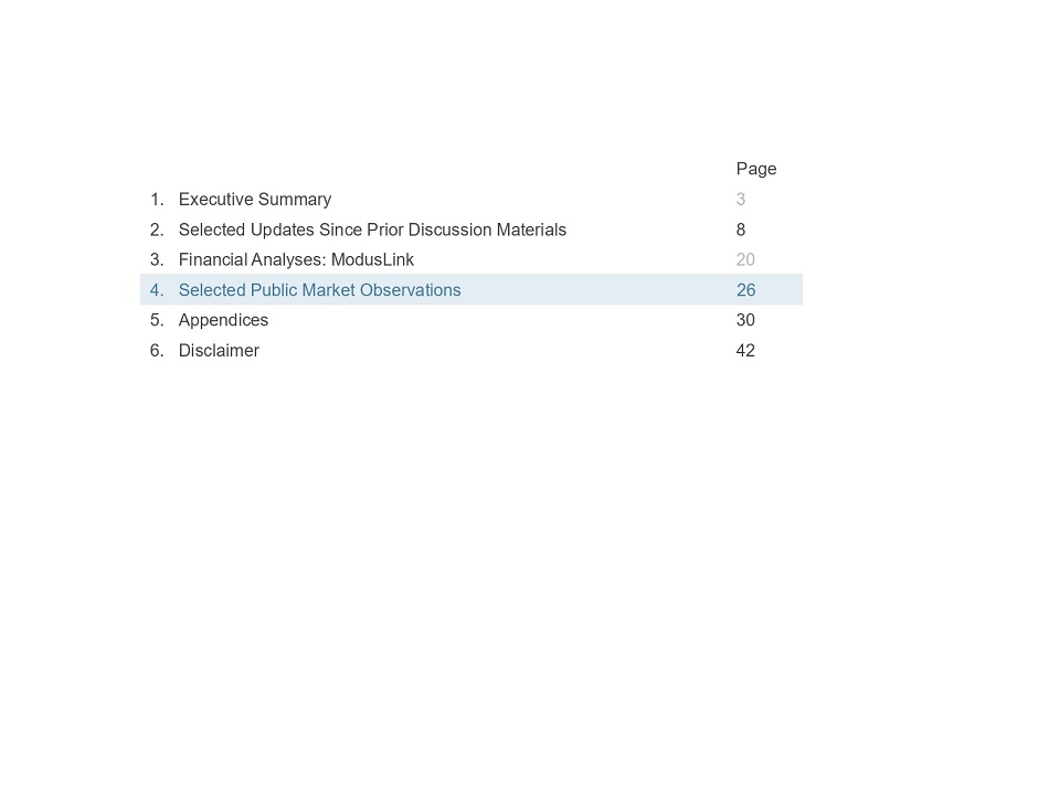 Page 1. Executive Summary 3 2. Selected Updates Since Prior Discussion Materials 8 3. Financial Analyses: ModusLink 20 4. Selected Public Market Observations 26 5. Appendices 30 6. Disclaimer 42