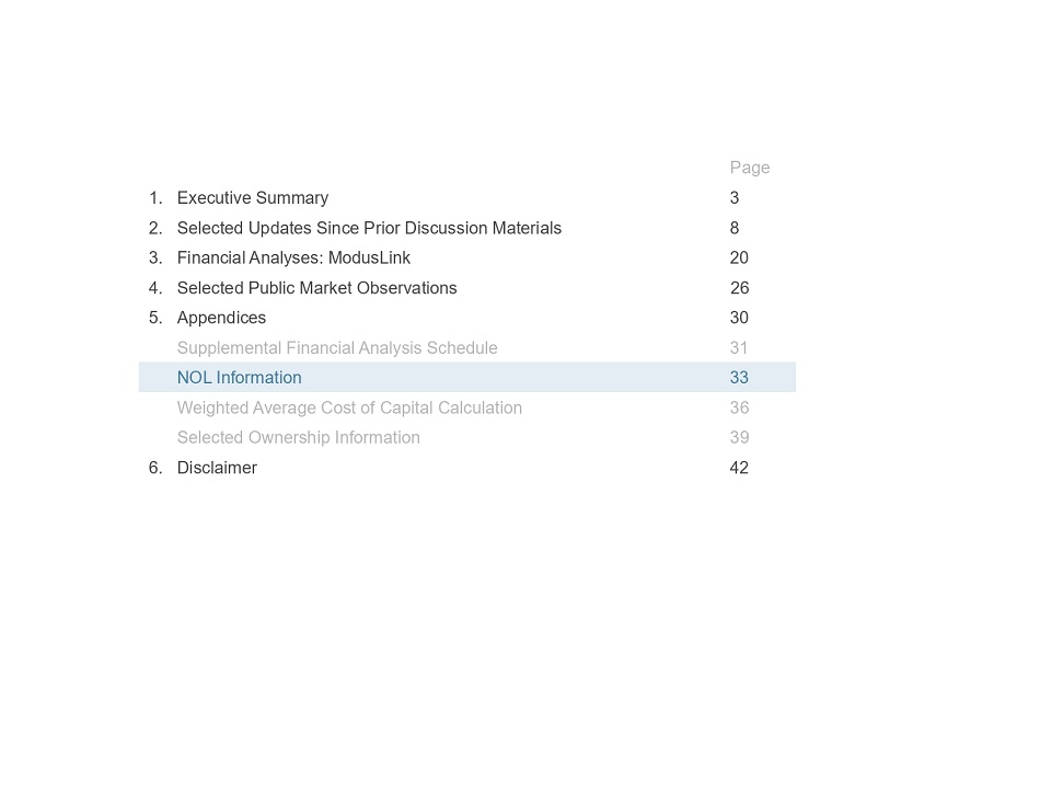 Page 1. Executive Summary 3 2. Selected Updates Since Prior Discussion Materials 8 3. Financial Analyses: ModusLink 20 4. Selected Public Market Observations 26 5. Appendices 30 Supplemental Financial Analysis Schedule 31 NOL Information 33 Weighted Average Cost of Capital Calculation 36 Selected Ownership Information 39 6. Disclaimer 42