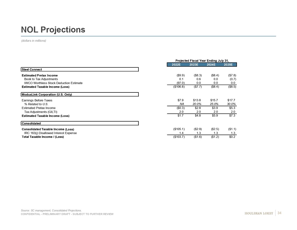 CONFIDENTIAL - PRELIMINARY DRAFT - SUBJECT TO FURTHER REVIEW NOL Projections Source: SC management, Consolidated Projections. (dollars in millions) Projected Fiscal Year Ending July 31, 2022E 2023E 2024E 2025E Steel Connect Estimated Pretax Income ($9.9) ($8.3) ($8.4) ($7.8) Book to Tax Adjustments 0.1 0.6 0.0 (0.7) IWCO Worthless Stock Deduction Estimate (97.0) 0.0 0.0 0.0 Estimated Taxable Income (Loss) ($106.8) ($7.7) ($8.4) ($8.5) ModusLink Corporation (U.S. Only) Earnings Before Taxes $7.9 $13.8 $15.7 $17.7 % Related to U.S. NA 20.0% 25.0% 30.0% Estimated Pretax Income ($0.3) $2.8 $3.9 $5.3 Tax Adjustments (GILTI) 2.0 2.0 2.0 2.0 Estimated Taxable Income (Loss) $1.7 $4.8 $5.9 $7.3 Consolidated Consolidated Taxable Income (Loss) ($105.1) ($2.9) ($2.5) ($1.1) IRC 163(j) Disallowed Interest Expense 1.4 1.3 1.3 1.3 Total Taxable Income / (Loss) ($103.7) ($1.6) ($1.2) $0.2 34
