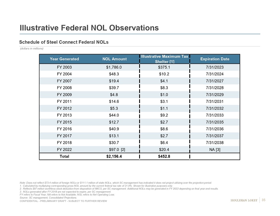 CONFIDENTIAL - PRELIMINARY DRAFT - SUBJECT TO FURTHER REVIEW Year Generated NOL Amount Illustrative Maximum Tax Shelter [1] Expiration Date FY 2003 $1,786.0 $375.1 7/31/2023 FY 2004 $48.3 $10.2 7/31/2024 FY 2007 $19.4 $4.1 7/31/2027 FY 2008 $39.7 $8.3 7/31/2028 FY 2009 $4.8 $1.0 7/31/2029 FY 2011 $14.6 $3.1 7/31/2031 FY 2012 $5.3 $1.1 7/31/2032 FY 2013 $44.0 $9.2 7/31/2033 FY 2015 $12.7 $2.7 7/31/2035 FY 2016 $40.9 $8.6 7/31/2036 FY 2017 $13.1 $2.7 7/31/2037 FY 2018 $30.7 $6.4 7/31/2038 FY 2022 $97.0 $20.4 NA [3] Total $2,156.4 $452.8 Illustrative Federal NOL Observations Note: Does not reflect $73.4 million of foreign NOLs or $111.1 million of state NOLs, which SC management has indicated it do es not project utilizing over the projection period. 1. Calculated by multiplying corresponding gross NOL amount by the current federal tax rate of 21.0%. Shown for illustrative pur pos es only. 2. Reflects $97 million worthless stock deduction from disposition of IWCO, per SC management. Additional NOLs may be generated in FY 2022 depending on final year - end results. 3. NOLs generated after FY 2018 are not expected to expire, per SC management. FY refers to Fiscal Year; NA refers to Not Available; NOL refers to Net Operating Loss. Source: SC management, Consolidated Projections. (dollars in millions) Schedule of Steel Connect Federal NOLs [2] 35