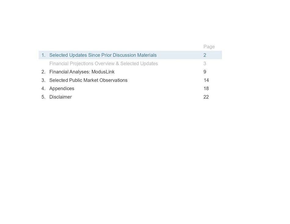 Page 1. Selected Updates Since Prior Discussion Materials 2 Financial Projections Overview & Selected Updates 3 2. Financial Analyses: ModusLink 9 3. Selected Public Market Observations 14 4. Appendices 18 5. Disclaimer 22