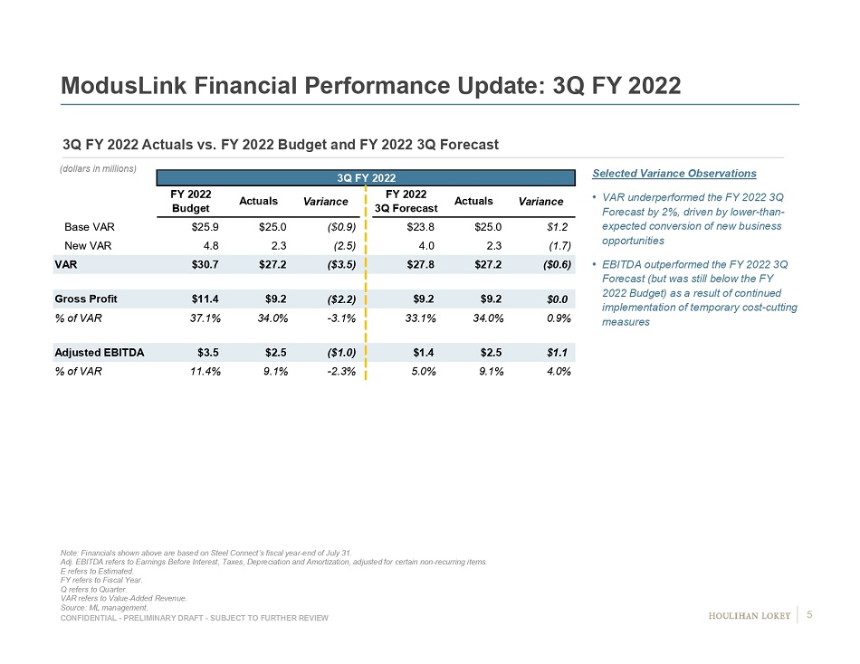 CONFIDENTIAL - PRELIMINARY DRAFT - SUBJECT TO FURTHER REVIEW Overview of Financial Projections Overview of ModusLink Projections Overview of NOL, SC and Consolidated Projections In February 2021, ML management, in consultation with SC management, prepared a set of long - term projections for FY 2021 through FY 2025 which were subsequently reviewed by the SC Board. In July/August 2021, ML management, in consultation with SC management, prepared its annual budget for FY 2022, which was fin ali zed in October 2021 based on feedback from and subsequently approved by the SC Board (such final budget, the “ FY 2022 Budget ”). The projections for FY 2023 through FY 2025 remained unchanged based on ML management’s assessment of the longer - term business outlook. ML underperformed relative to its FY 2022 Budget during the first fiscal quarter, with ML management also observing headwinds th at they believed would translate into near - term pressure on financial results. Accordingly, in December 2021, ML management 1 updated its forecast for FY 2022 (the “ FY 2022 2Q Forecast ”), but left its projections unchanged for FY 2023 to FY 2025. In the second fiscal quarter, ML continued to underperform relative to its FY 2022 Budget (VAR was ~5% lower than budgeted) b ut outperformed the FY 2022 2Q Forecast (VAR was ~3% higher than estimated). In February 2022, ML management 1 updated its forecast for FY 2022 (the “ FY 2022 3Q Forecast ”), which contemplated a slower than previously estimated ramp - up of new customer accounts but maintained effectively the same full - year E BITDA level relative to the FY 2022 2Q Forecast. Projections for FY 2023 to FY 2025 remained unchanged. In the third fiscal quarter, ML continued to face headwinds with new customer conversion, driving VAR underperformance relati ve to the FY 2022 Budget (~11%) and the FY 2022 3Q Forecast (~2%). In May 2022, ML management 1 updated its forecast for FY 2022 (the “ Current FY 2022 Forecast ”) to reflect the latest outlook, which contemplates a slower ramp - up of new customer accounts and lower EBITDA relative to the FY 2022 3Q Forecast. Projections f or FY 2023 to FY 2025 remained unchanged. The Current FY 2022 Forecast, together with the FY 2023 to FY 2025 projections, which have been authorized by the Special Com mit tee for Houlihan Lokey’s use in these discussion materials, are referred to herein as the “ ML Projections ”. In February 2021, SC management prepared corporate expense projections for FY 2021 through FY 2025, with the FY 2022 projecti ons subsequently updated in connection with the annual budgeting process that was finalized in October 2021 (and FY 2023 – FY 2025 projections remaining unc hanged). Such figures are referred to herein as the “ Pre - IWCO Disposition Corporate Expense Projections ”. In May 2022, SC management revised such projections to reflect corporate savings opportunities identified at Steel Connect following the disposition of IWCO. Such projections, as authorized by the S pec ial Committee for Houlihan Lokey’s use in these discussion materials, are referred to herein as the “ Corporate Expense Projections ”. Following the disposition of IWCO as well as the preparation of the updated Corporate Expense Projections, SC and ML manageme nts prepared revised taxable income projections and NOL utilization assumptions, which were authorized by the Special Committee for Houlihan Lokey’s use in these discussion materials. Such projections are referred to herein as the “ NOL Projections ”. The Corporate Expense Projections, together with the ML Projections and the NOL Projections, are referred to herein as the “ Consolidated Projections ”. 1. The FY 2022 2Q Forecast, FY 2022 3Q Forecast and Current FY 2022 Forecast were prepared by ML management in consultation w ith SC management and reviewed by the SC Board. Source: ML and SC managements. 4