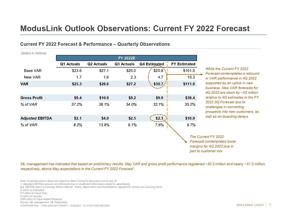 CONFIDENTIAL - PRELIMINARY DRAFT - SUBJECT TO FURTHER REVIEW ModusLink Financial Performance Update: 3Q FY 2022 Note: Financials shown above are based on Steel Connect’s fiscal year - end of July 31. Adj. EBITDA refers to Earnings Before Interest, Taxes, Depreciation and Amortization, adjusted for certain non - recurring items. E refers to Estimated. FY refers to Fiscal Year. Q refers to Quarter. VAR refers to Value - Added Revenue. Source: ML management. (dollars in millions) 3Q FY 2022 Actuals vs. FY 2022 Budget and FY 2022 3Q Forecast Selected Variance Observations • VAR underperformed the FY 2022 3Q Forecast by 2%, driven by lower - than - expected conversion of new business opportunities • EBITDA outperformed the FY 2022 3Q Forecast (but was still below the FY 2022 Budget) as a result of continued implementation of temporary cost - cutting measures 3Q FY 2022 Base VAR $25.9 $25.0 ($0.9) $23.8 $25.0 $1.2 New VAR 4.8 2.3 (2.5) 4.0 2.3 (1.7) VAR $30.7 $27.2 ($3.5) $27.8 $27.2 ($0.6) Gross Profit $11.4 $9.2 ($2.2) $9.2 $9.2 $0.0 % of VAR 37.1% 34.0% -3.1% 33.1% 34.0% 0.9% Adjusted EBITDA $3.5 $2.5 ($1.0) $1.4 $2.5 $1.1 % of VAR 11.4% 9.1% -2.3% 5.0% 9.1% 4.0% Variance FY 2022 Budget Actuals Variance FY 2022 3Q Forecast Actuals 5
