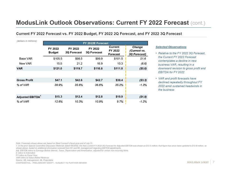 CONFIDENTIAL - PRELIMINARY DRAFT - SUBJECT TO FURTHER REVIEW FY 2022E Base VAR $23.6 $27.1 $25.0 $25.8 $101.5 New VAR 1.7 1.6 2.3 4.7 10.3 VAR $25.3 $28.6 $27.2 $30.7 $111.8 Gross Profit $9.4 $10.9 $9.2 $9.9 $39.4 % of VAR 37.2% 38.1% 34.0% 32.1% 35.2% Adjusted EBITDA $2.1 $4.0 $2.5 $2.3 $10.9 % of VAR 8.2% 13.9% 9.1% 7.6% 9.7% Q2 Actuals FY EstimatedQ1 Actuals Q4 EstimatedQ3 Actuals ModusLink Outlook Observations: Current FY 2022 Forecast Note: Financials shown above are based on Steel Connect’s fiscal year - end of July 31. 1. Adjusted EBITDA variance not referenced due to insufficient information related to adjustments. Adj. EBITDA refers to Earnings Before Interest, Taxes, Depreciation and Amortization, adjusted for certain non - recurring items. E refers to Estimated. FY refers to Fiscal Year. Q refers to Quarter. VAR refers to Value - Added Revenue. Source: ML management, ML Projections. (dollars in millions) Current FY 2022 Forecast & Performance – Quarterly Observations While the Current FY 2022 Forecast contemplates a rebound in VAR performance in 4Q 2022 supported by an uptick in new business, New VAR forecasts for 4Q 2022 are down by ~$5 million relative to 4Q estimates in the FY 2022 3Q Forecast due to challenges in converting prospects into new customers, as well as on - boarding delays The Current FY 2022 Forecast contemplates lower margins for 4Q 2022 due in part to customer mix ML management has indicated that based on preliminary results, May VAR and gross profit performance registered ~$0.2 million and nearly ~$1.0 million, respectively, above May expectations in the Current FY 2022 Forecast 1 6