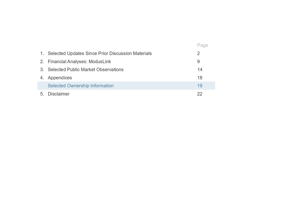 Page 1. Selected Updates Since Prior Discussion Materials 2 2. Financial Analyses: ModusLink 9 3. Selected Public Market Observations 14 4. Appendices 18 Selected Ownership Information 19 5. Disclaimer 22