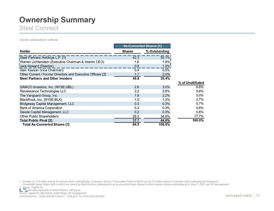 CONFIDENTIAL - PRELIMINARY DRAFT - SUBJECT TO FURTHER REVIEW Ownership Summary Steel Connect 1. Includes (i) 17.9 million shares of common stock underlying the Company’s Series C Convertible Preferred Stock and (ii) 6.3 m ill ion shares of common stock underlying the Company’s Convertible Senior Notes, both of which are owned by Steel Partners, presented on an as - converted basis. Based on total common s hares outstanding as of June 1, 2022, per SC management. 2. Source: Capital IQ. Denotes ownership of Steel Partners’ 13D group. Source: Capital IQ, Bloomberg, public filings, SC management. (shares outstanding in millions) As-Converted Shares [1] Holder Shares % Outstanding Steel Partners Holdings L.P. [1] 42.3 50.1% Warren Lichtenstein (Executive Chairman & Interim CEO) 1.6 1.9% Jack Howard (Director) 0.9 1.0% Glen Kassan (Vice Chairman) 0.4 0.5% Other Current / Former Directors and Executive Officers [2] 1.7 2.0% Steel Partners and Other Insiders 46.8 55.4% GAMCO Investors, Inc. (NYSE:GBL) 2.6 3.0% 6.8% Renaissance Technologies LLC 2.2 2.6% 5.8% The Vanguard Group, Inc. 1.9 2.2% 5.0% BlackRock, Inc. (NYSE:BLK) 1.0 1.2% 2.7% Bridgeway Capital Management, LLC 0.3 0.3% 0.7% Bank of America Corporation 0.2 0.3% 0.6% Geode Capital Management, LLC 0.2 0.3% 0.6% Other Public Shareholders 29.3 34.6% 77.7% Total Public Float [2] 37.7 44.6% 100.0% Total As-Converted Shares [1] 84.5 100.0% % of Unafilliated 20