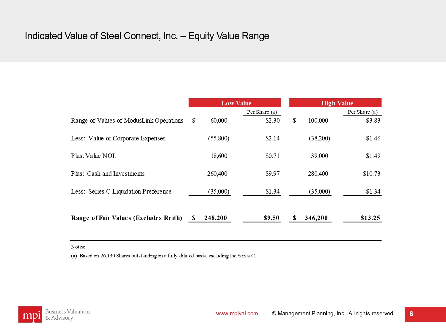 Indicated Value of Steel Connect, Inc. – Equity Value Range www.mpival.com | © Management Planning, Inc. All rights reserved. 6 Low Value High Value Per Share (a) Per Share (a) Range of Values of ModusLink Operations 60,000$ $2.30 100,000$ $3.83 Less: Value of Corporate Expenses (55,800) -$2.14 (38,200) -$1.46 Plus: Value NOL 18,600 $0.71 39,000 $1.49 Plus: Cash and Investments 260,400 $9.97 280,400 $10.73 Less: Series C Liquidation Preference (35,000) -$1.34 (35,000) -$1.34 Range of Fair Values (Excludes Reith) 248,200$ $9.50 346,200$ $13.25 Notes: (a) Based on 26,130 Shares outstanding on a fully diluted basis, excluding the Series C.