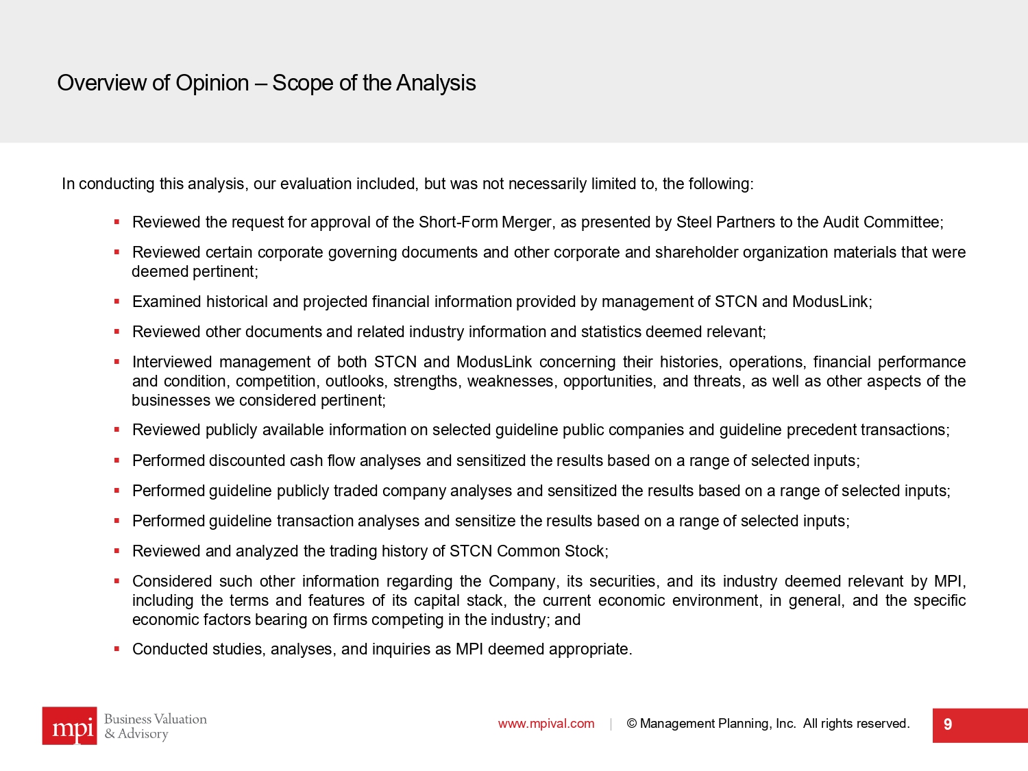 Overview of Opinion – Scope of the Analysis In conducting this analysis, our evaluation included, but was not necessarily limited to, the following : ▪ Reviewed the request for approval of the Short - Form Merger, as presented by Steel Partners to the Audit Committee ; ▪ Reviewed certain corporate governing documents and other corporate and shareholder organization materials that were deemed pertinent ; ▪ Examined historical and projected financial information provided by management of STCN and ModusLink ; ▪ Reviewed other documents and related industry information and statistics deemed relevant ; ▪ Interviewed management of both STCN and ModusLink concerning their histories, operations, financial performance and condition, competition, outlooks, strengths, weaknesses, opportunities, and threats, as well as other aspects of the businesses we considered pertinent ; ▪ Reviewed publicly available information on selected guideline public companies and guideline precedent transactions ; ▪ Performed discounted cash flow analyses and sensitized the results based on a range of selected inputs ; ▪ Performed guideline publicly traded company analyses and sensitized the results based on a range of selected inputs ; ▪ Performed guideline transaction analyses and sensitize the results based on a range of selected inputs ; ▪ Reviewed and analyzed the trading history of STCN Common Stock ; ▪ Considered such other information regarding the Company, its securities, and its industry deemed relevant by MPI, including the terms and features of its capital stack, the current economic environment, in general, and the specific economic factors bearing on firms competing in the industry ; and ▪ Conducted studies, analyses, and inquiries as MPI deemed appropriate . www.mpival.com | © Management Planning, Inc. All rights reserved. 9